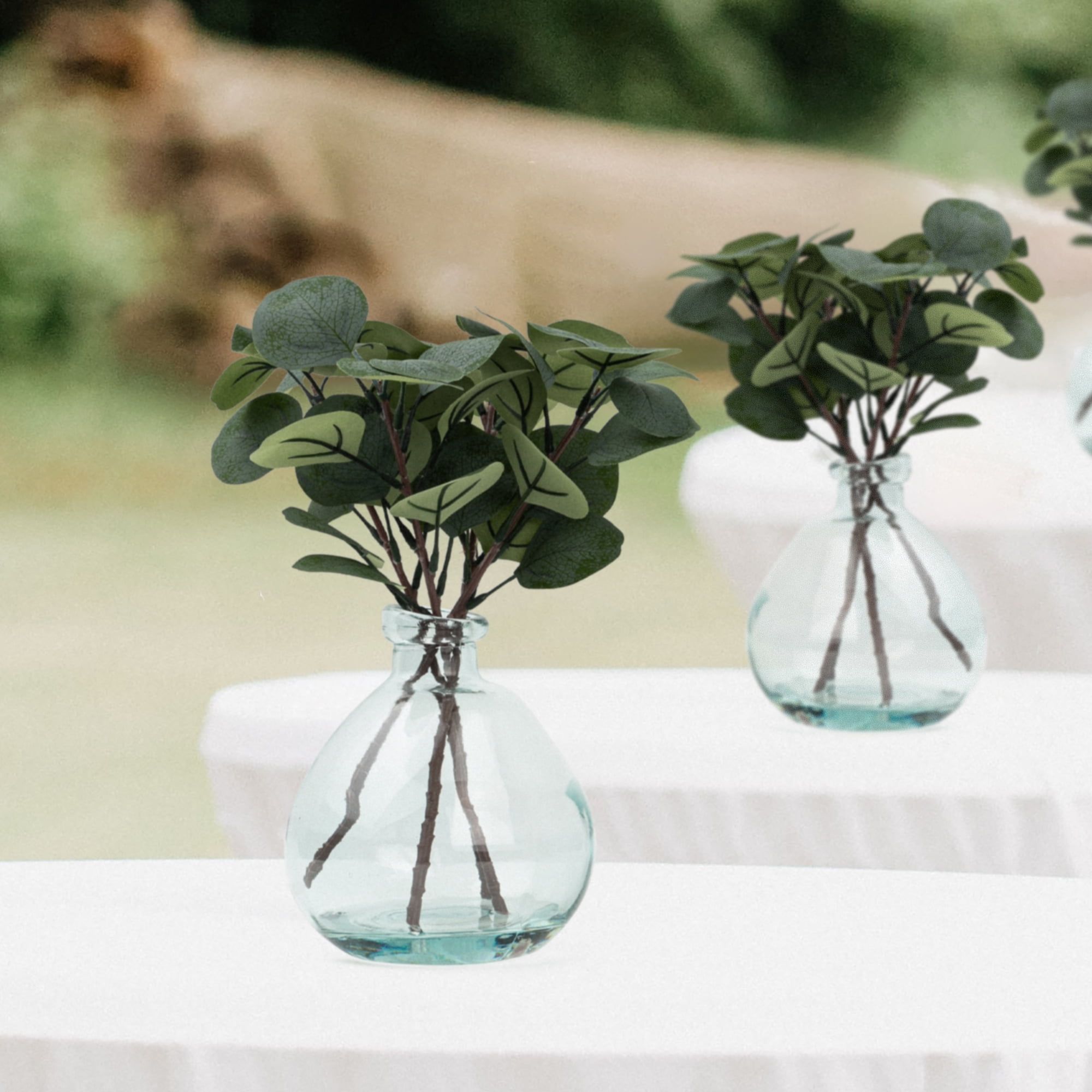 Realistic beauty! This 12" Artificial Green Eucalyptus plant in a blown glass vase works beautifully with your indoor home décor. Its silk lifelike foliage, faux water and hand-blown looking vase adds a pop of color to any room. Use this plant to elegantly decorate a table, nightstand, bookshelf, desk, or countertop. Enjoy this long-lasting Eucalyptus beauty without having to worry about adding water, rearranging or allergies. Perfect to use as a centerpiece for events, celebrations, bridal showers or weddings and makes a beautiful gift.
