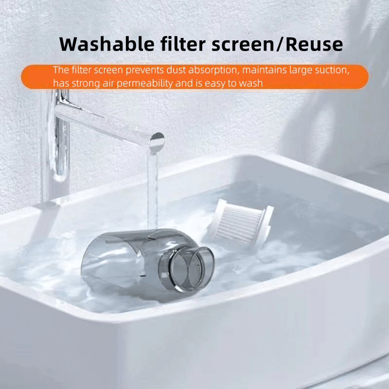 - Washable HEPA Filter The HEPA filter is washable and reusable, which keeps dust and dirt out to avoid blockage. Take the filter out of the dust cup of the vacuum cleaner, wash it with water and dry it for second use. (Using tip: If the vacuum filter is full of dirt or suction weakness, please clean the filter in time to make sure the dust buster can work normally).