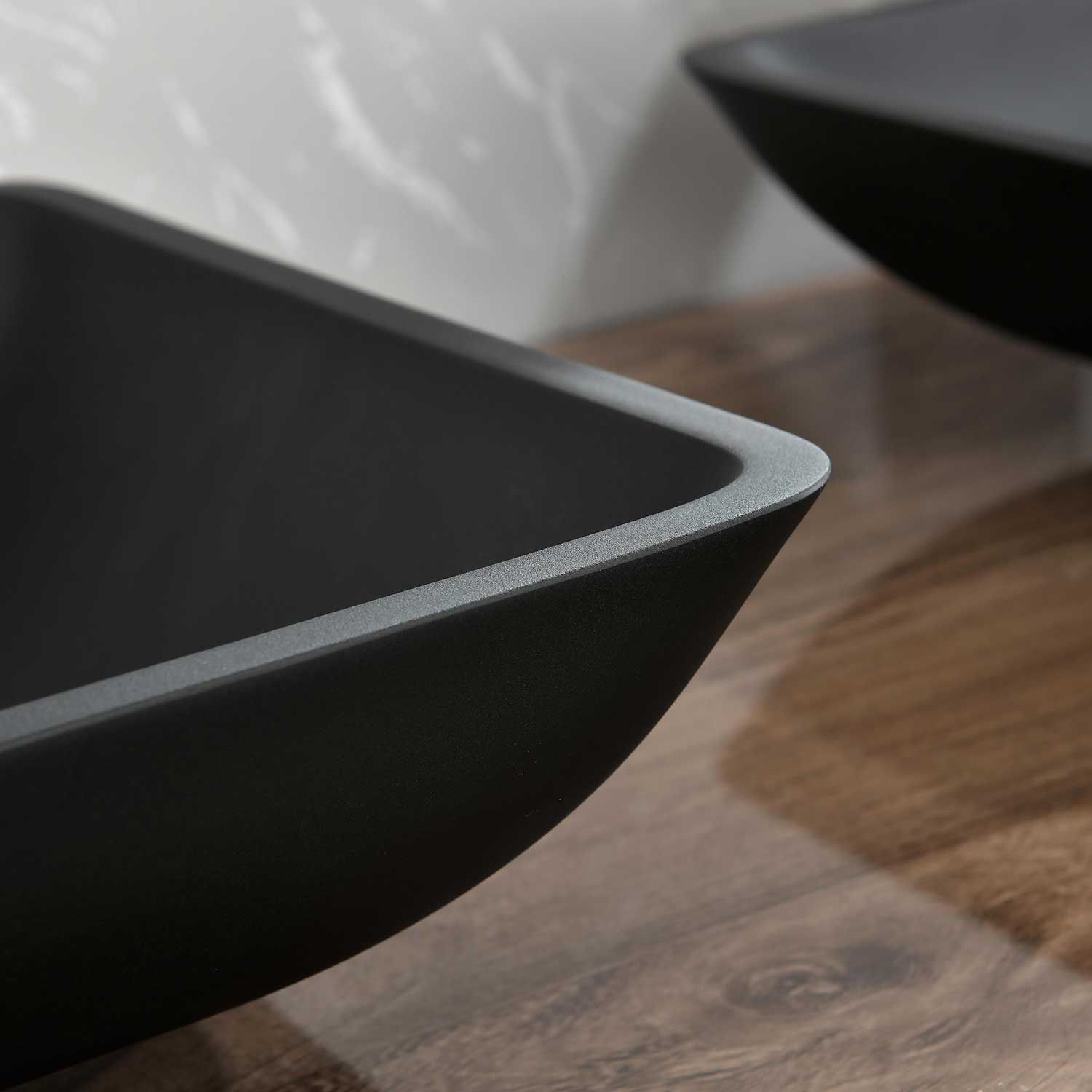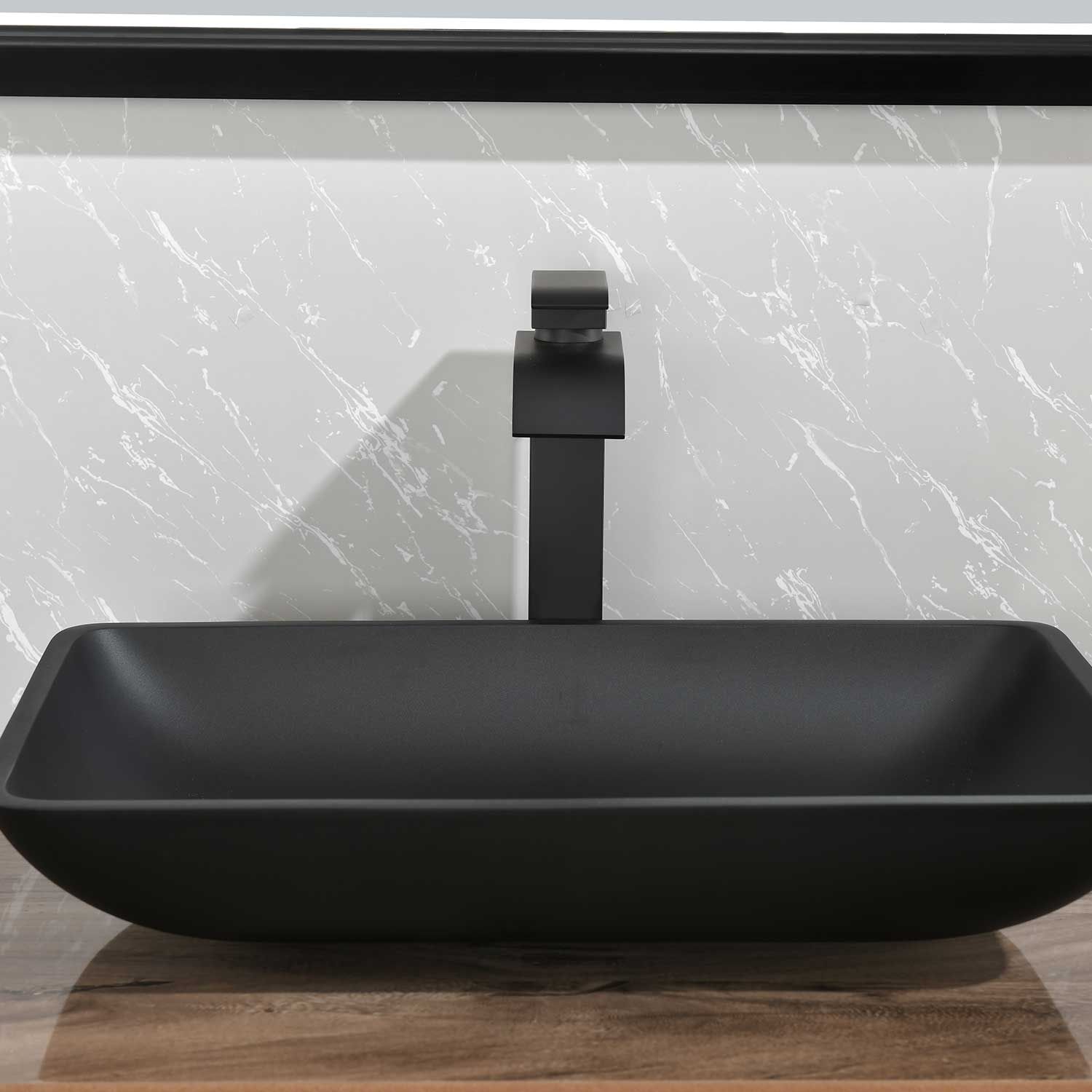 14.38″ L -22.25″ W -4-3/8 in. H Matte Shell Glass Rectangular Vessel Bathroom Sink in Black with Faucet and Pop-Up Drain in Matte Black