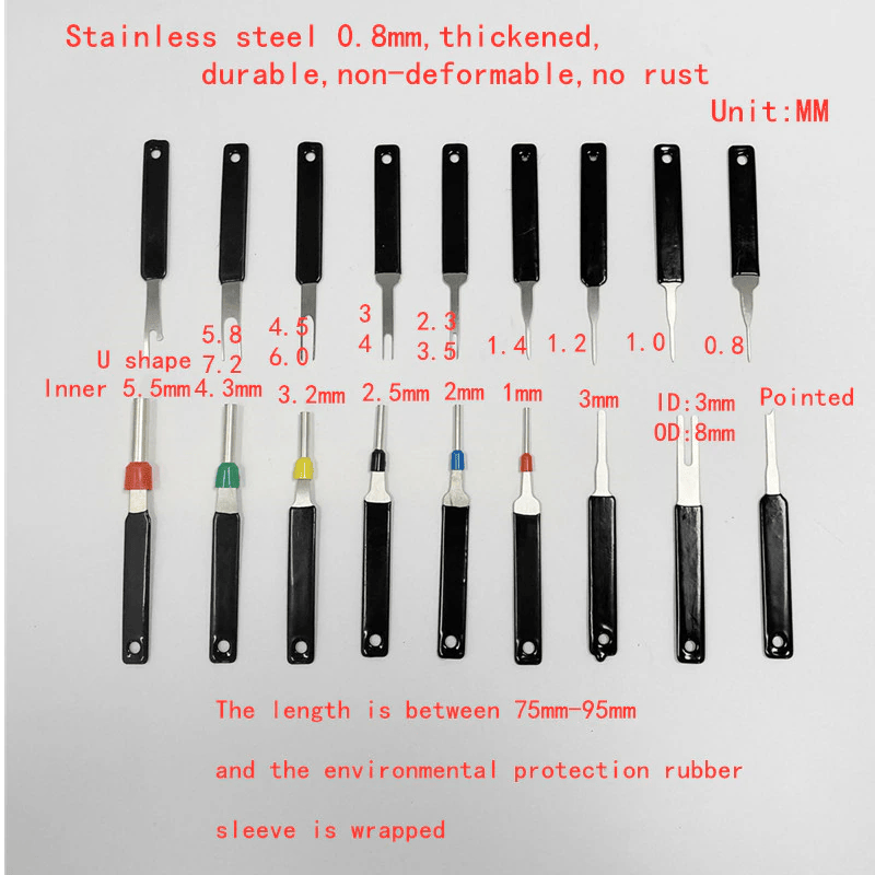The terminal removal tool is made of premium quality stainless steel, Thickness 0.7mm, More Durable & More thicker than 0.5mm universal Terminal tool kit