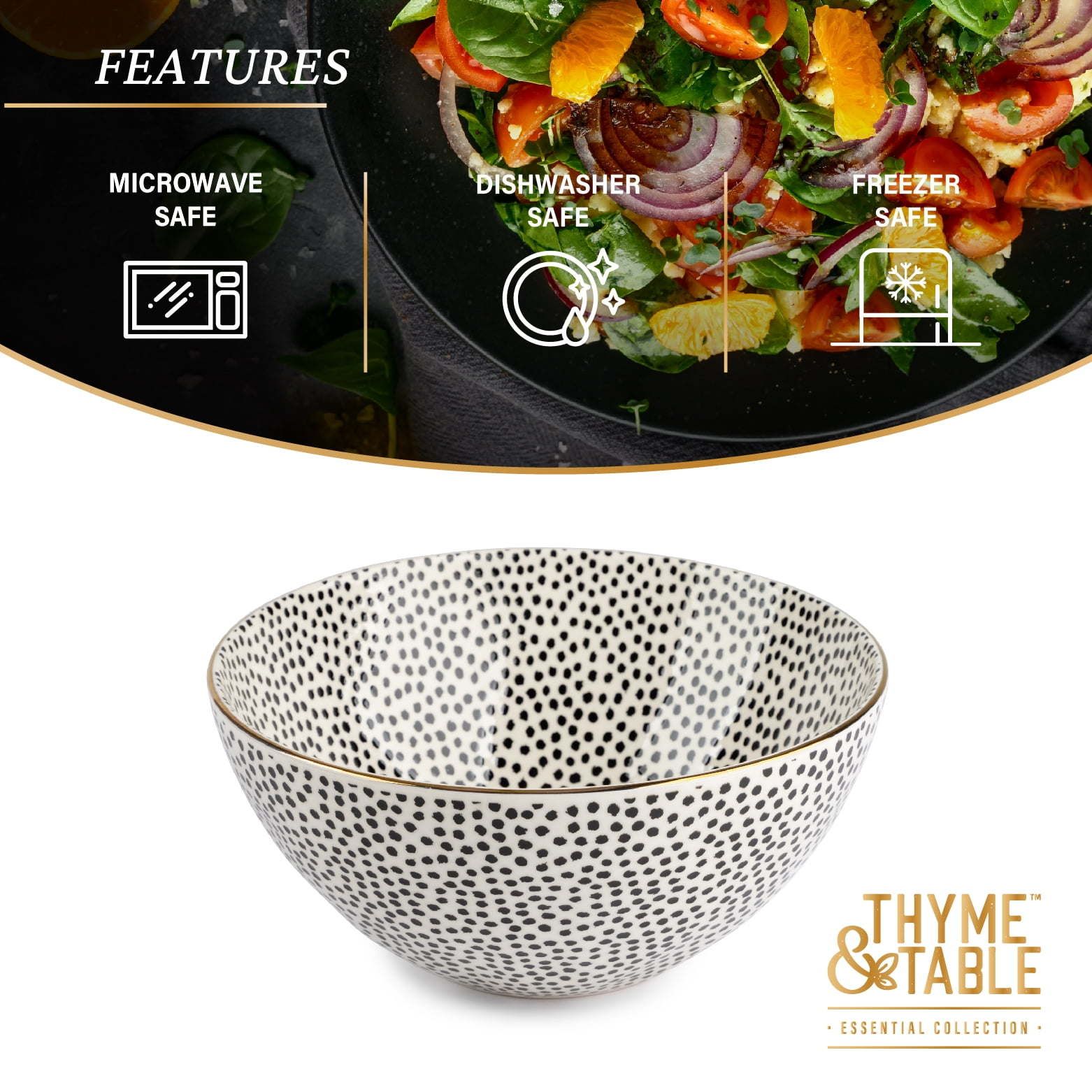Thyme & Table Stoneware Bowl, Dot Collection is the essential piece for versatile and stylish serving. This bowl combines functionality with a timeless design, making it a must-have addition to your kitchen. Made from high-quality ceramic, this bowl offers durability and a sleek, polished look. This bowl is designed to showcase your soups and stews and salads beautifully. The sturdy construction of the ceramic bowl ensures its longevity, making it a reliable companion for years to come. Microwave and dishwasher safe.