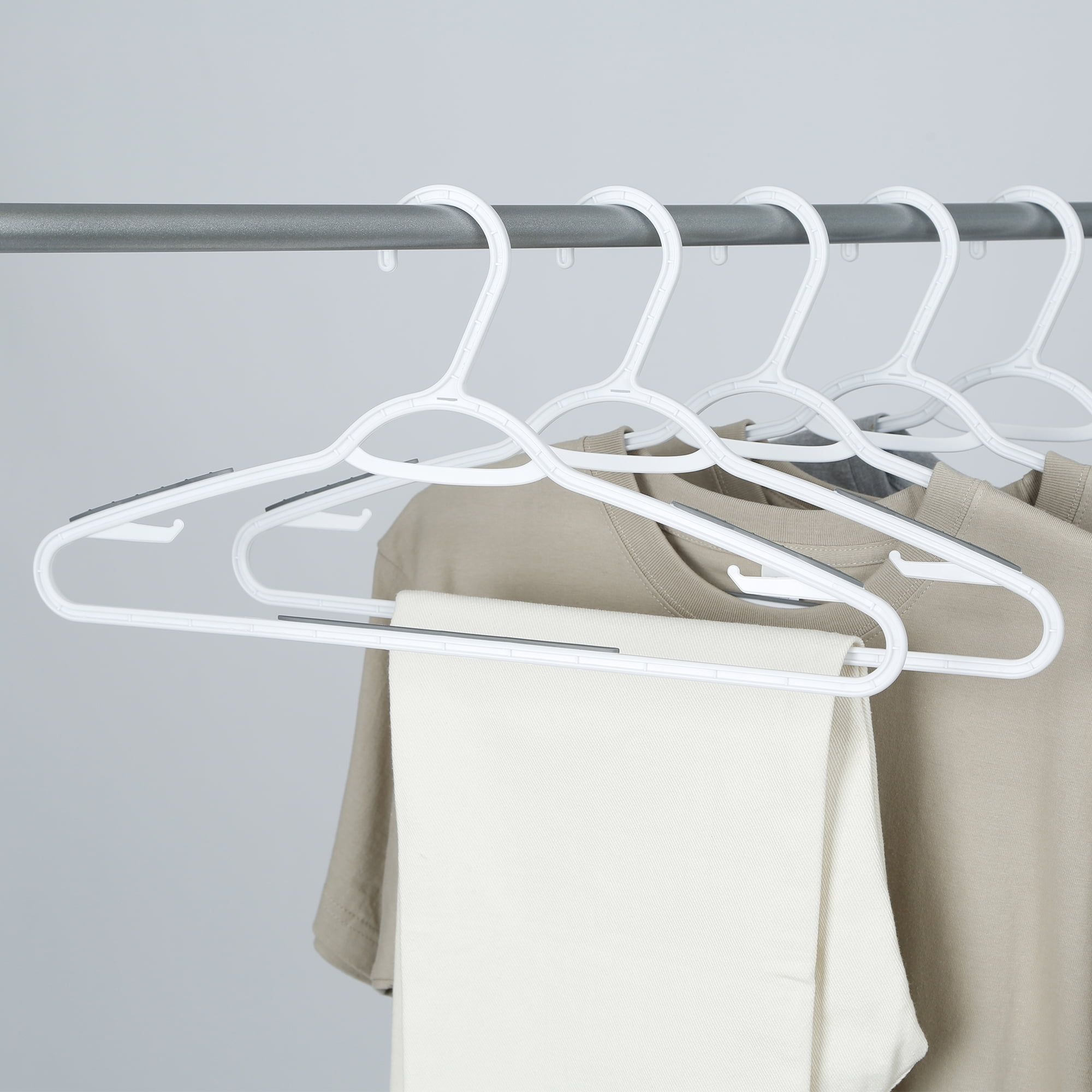 These are the new 10 Pack Non-Slip Hangers, brought to you by . The non-slip feature of these hangers is relevant in the aspect that the shoulders of these hangers keep your garments secure. The non-slip shoulder effectively prevents slipping and is able to keep your garments off of the ground. They have a trendy new design that was not only built for looks, but also for durability. You will find that they consist of TPE grips specifically located on each top corner where the shoulders of a shirt or dress would sit. also wanted to ensure that they could be used for pants with the same effective rate as well and decided to add one additional TPE grip into the middle of the bottom bar. Positioning it in this spot give the Non-Slip Hanger an edge over those old plastic tubular hangers by giving its consumer that special something extra.