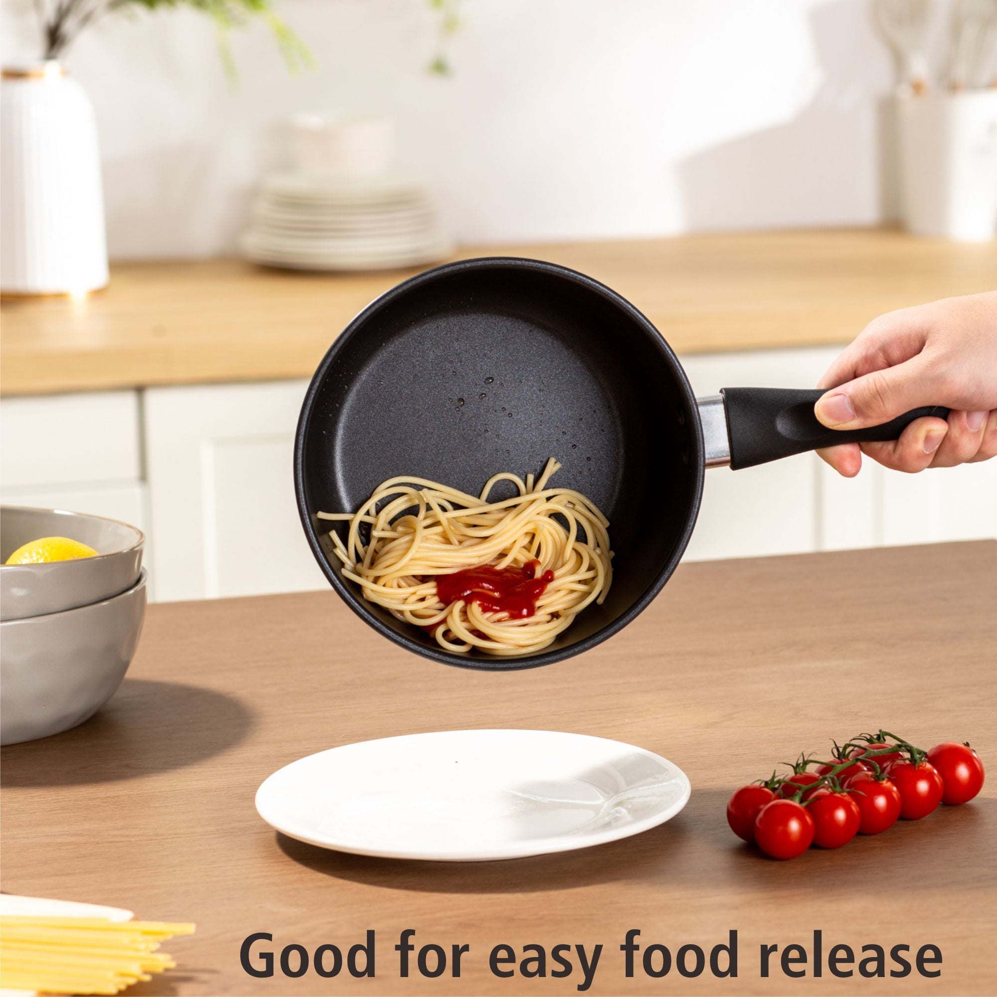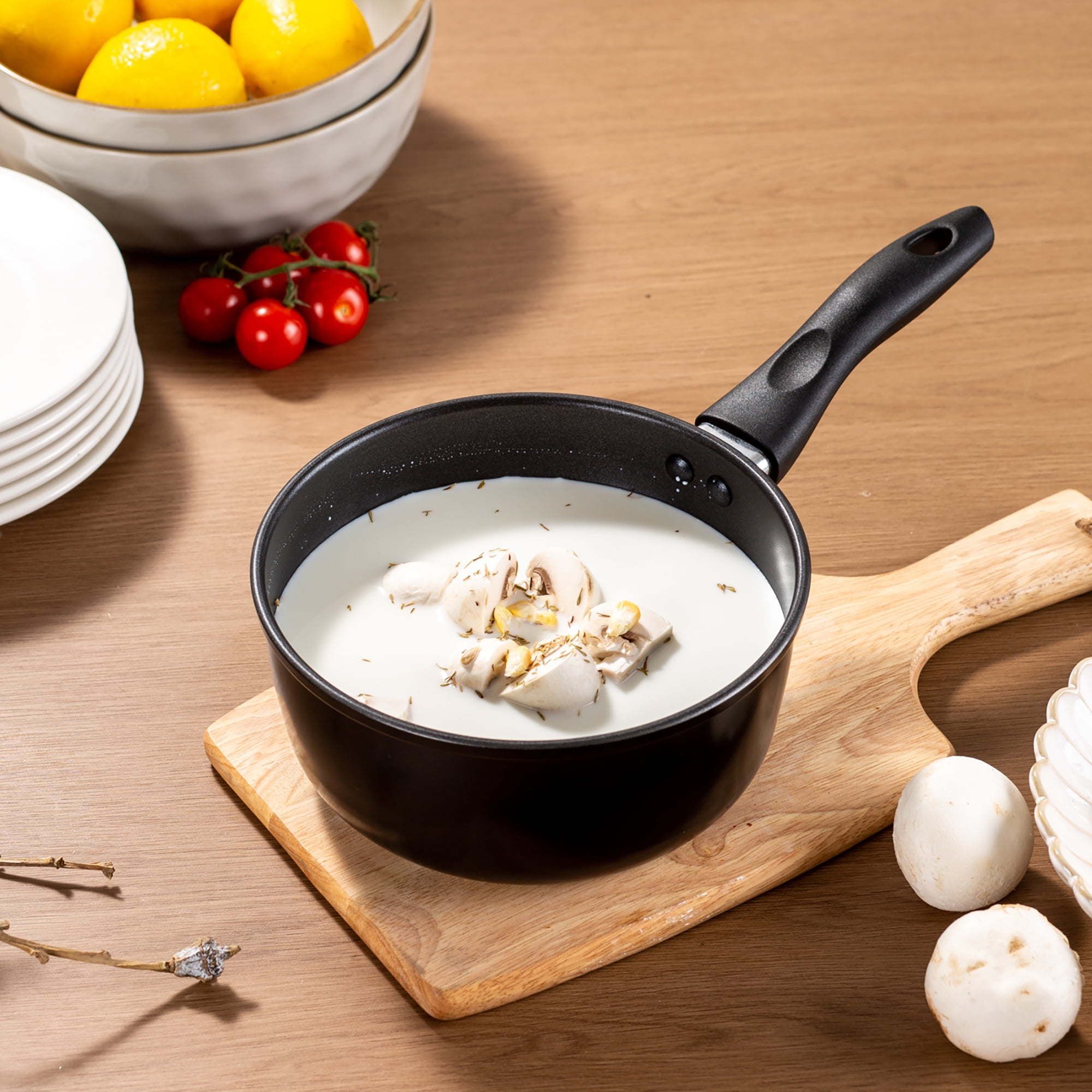 basic aluminum nonstick 2qt saucepan 18cm black.Ideal for everyday multi-use at home, the saucepan heats quickly and evenly with its aluminum body.Its interior is coated with 2 layers of non-stick coating which makes it easy cook and easy clean-up. Riveted handle for strong connection. Its cool touch handle make it easy and comfortable handling. And it’s dishwasher safe. Suitable for all cooktops except induction.
