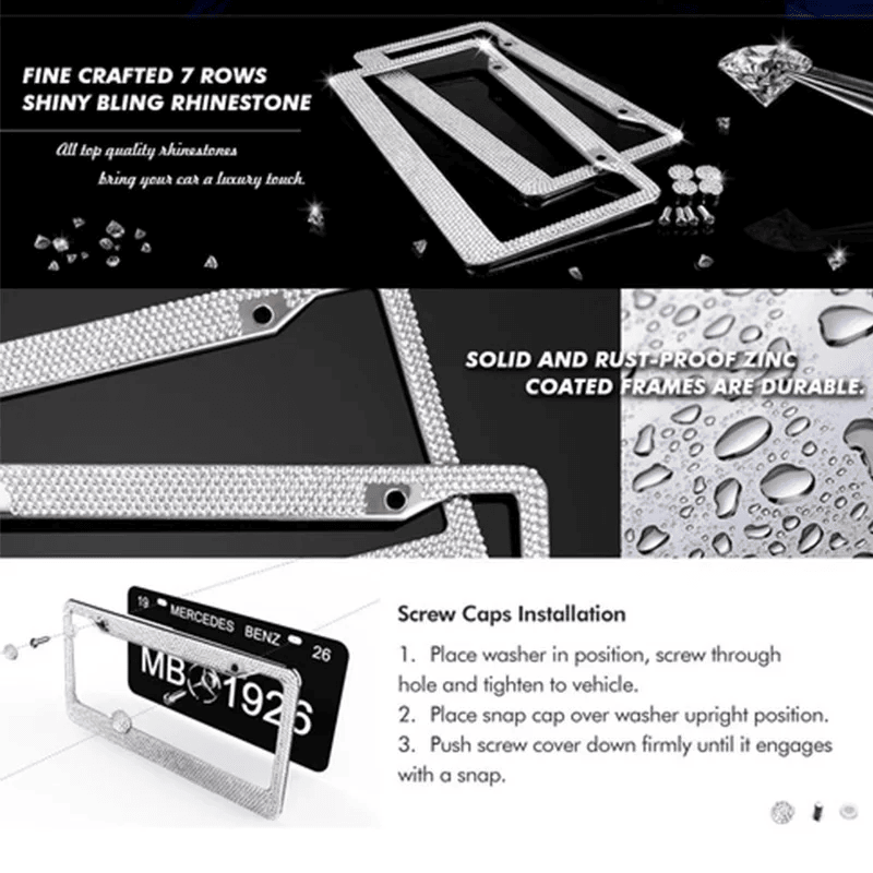 - Our license plate frames can not only protect your license plate but also decorate your car with glittering rhinestones!