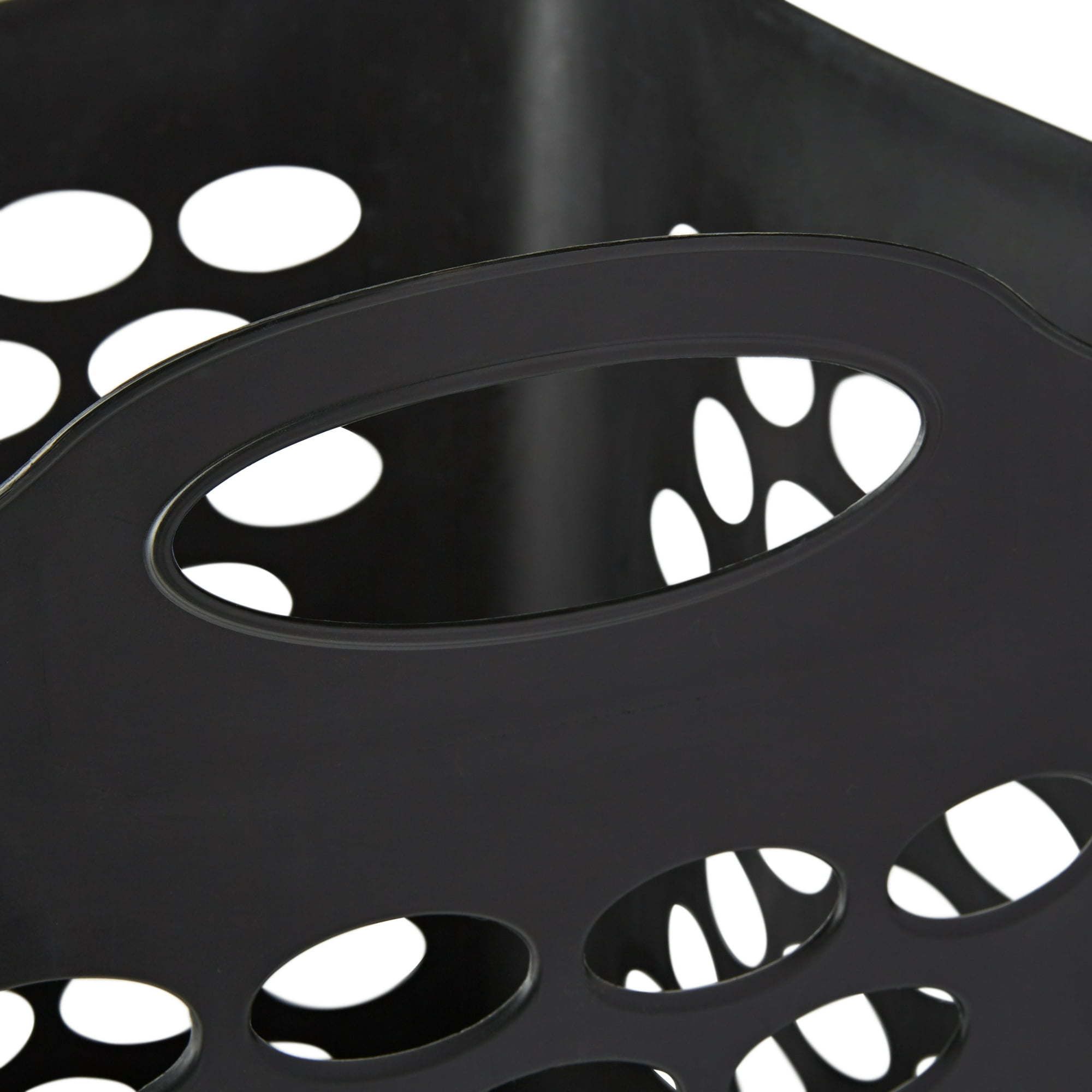 The Flexible Black Laundry Hamper offers practical storage for busy households, holding up to 2 bushels of clothing in a space-saving square design. This durable plastic hamper features a geometric pattern of ventilation holes that allows garments to breathe, helping prevent musty odors and mildew. With sturdy dual handles, transporting laundry from bedrooms to the washing machine becomes effortless, even with heavier loads. The lightweight yet robust construction makes this hamper perfect for adults and teens alike, while its sleek black finish looks neat in any bathroom, bedroom, or closet. The Flexible Black Laundry Hamper combines functionality with style, keeping clothes organized until laundry day.