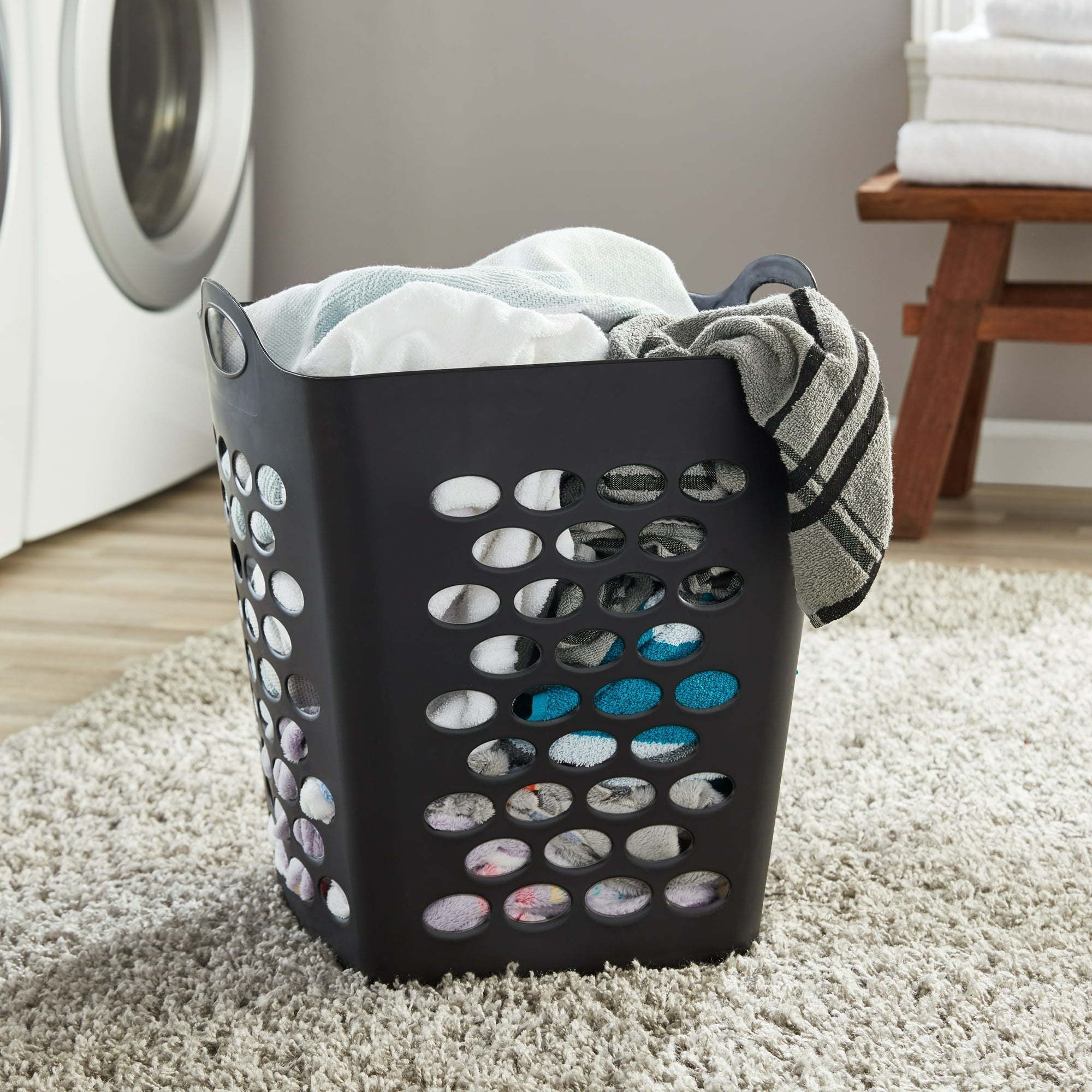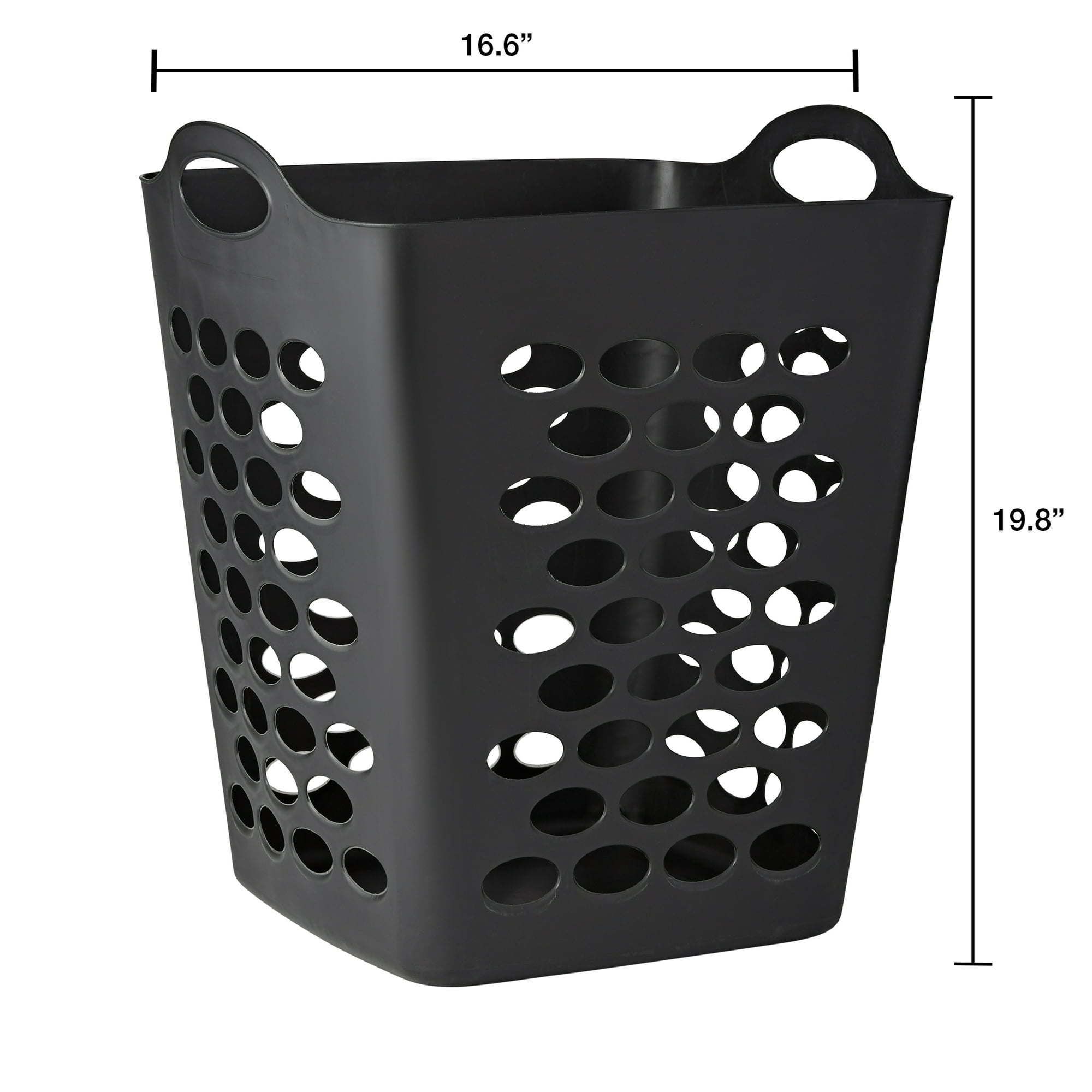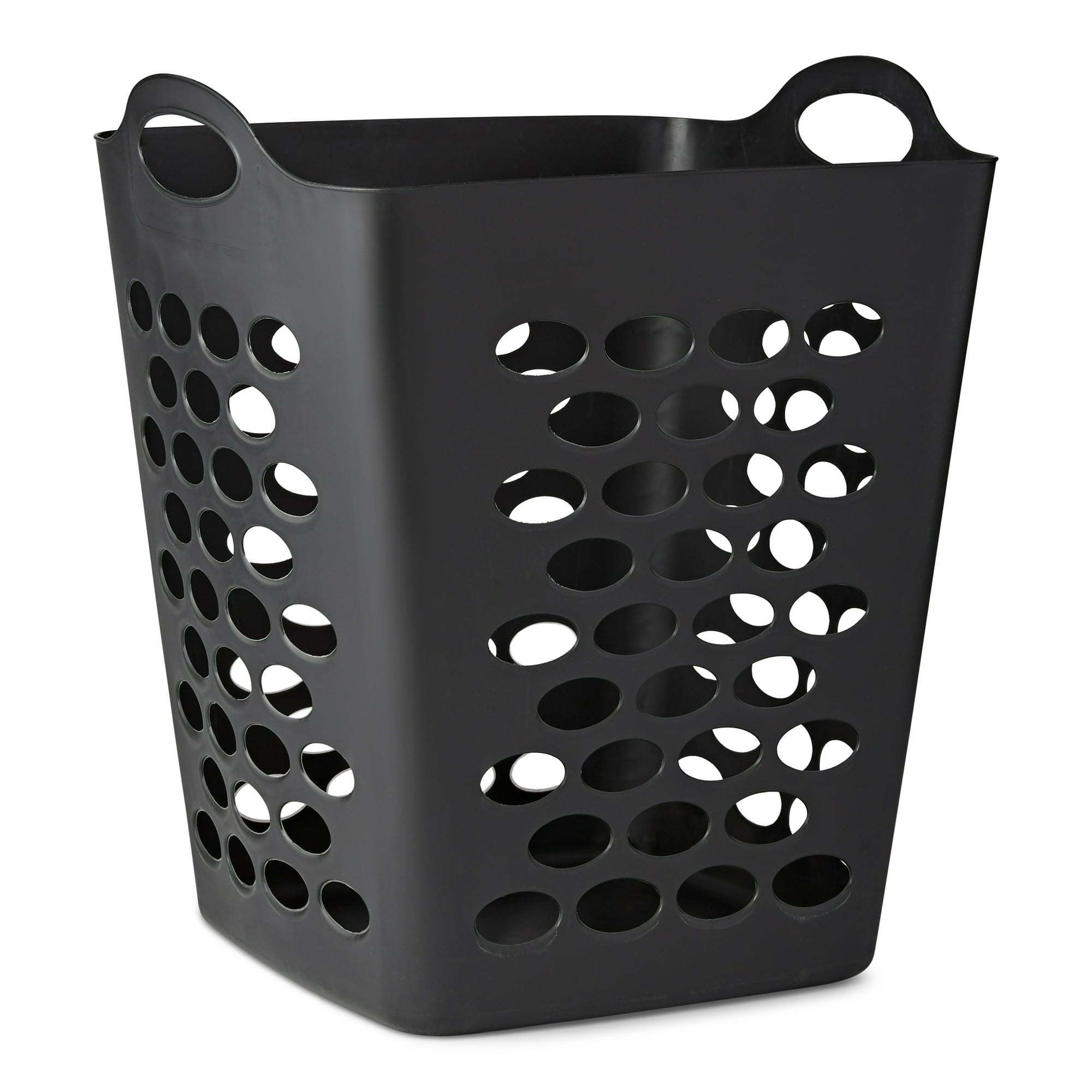 Flexible Black Laundry Hamper offers practical storage for busy households, holding up to 2 bushels of clothing in a space-saving square design. This durable plastic hamper features a geometric pattern of ventilation holes that allows garments to breathe, helping prevent musty odors and mildew. With sturdy dual handles, transporting laundry from bedrooms to the washing machine becomes effortless, even with heavier loads. The lightweight yet robust construction makes this hamper perfect for adults and teens alike, while its sleek black finish looks neat in any bathroom, bedroom, or closet. Flexible Black Laundry Hamper combines functionality with style, keeping clothes organized until laundry day.