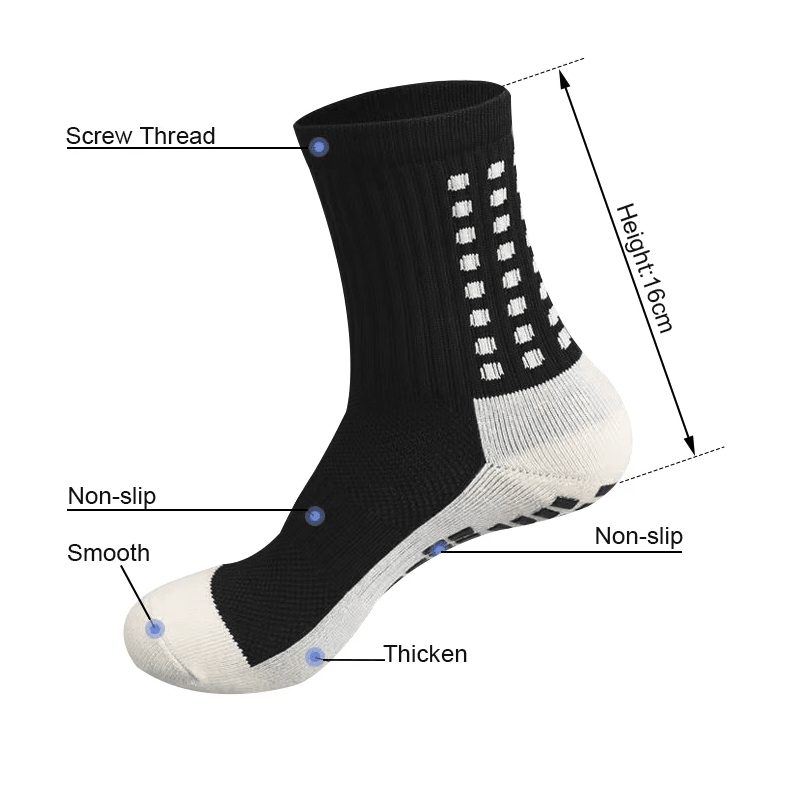 Our socks are specially designed to provide you with unparalleled grip and security within your footwear. When wearing other soccer socks, slipping occurs between your foot, the socks and your footwear which is the cause of your sore feet and blisters. However, here, the Rubber Pad Sole Technology is used to connect these layers together to act as one so that no slipping occurs, therefore eliminating foot pain and blisters during and after exercise.