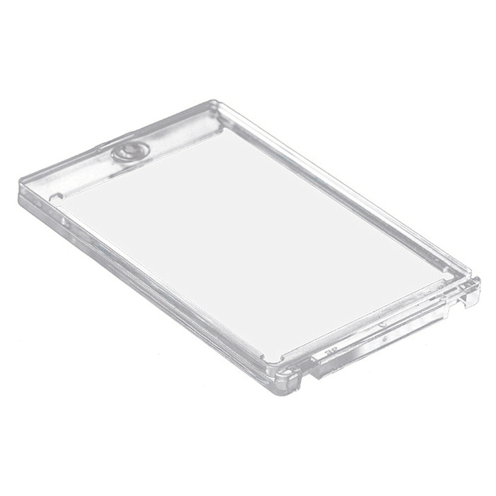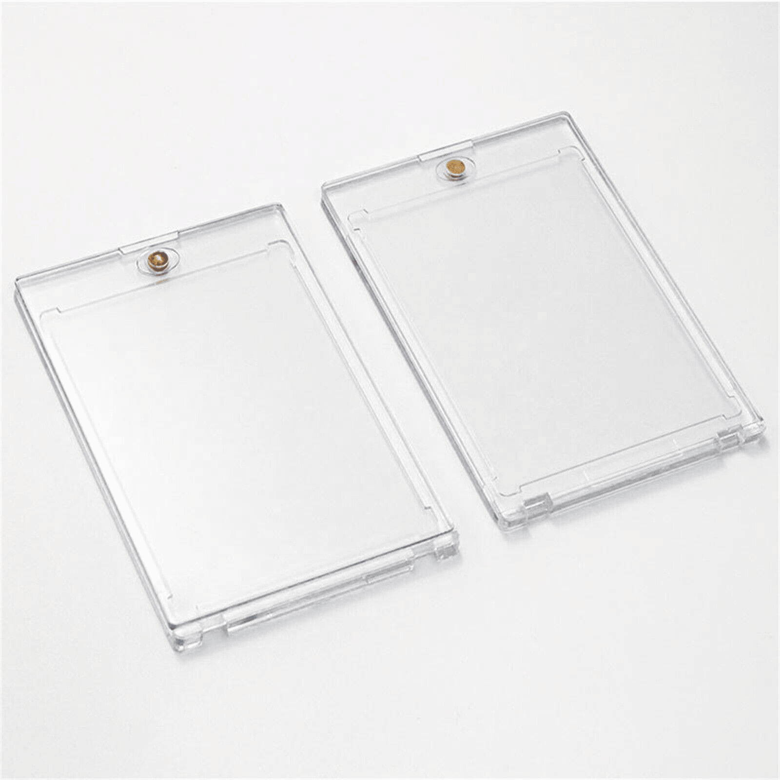 - Upgraded Protective Material Our trading card protectors hard plastic are made of UV-resistant material, non-toxic and tasteless, sturdy and durable. The baseball card protectors keep your cards free from scratching, folding, and bending. The strong suction magnet allows you to close the baseball card holder effortlessly.