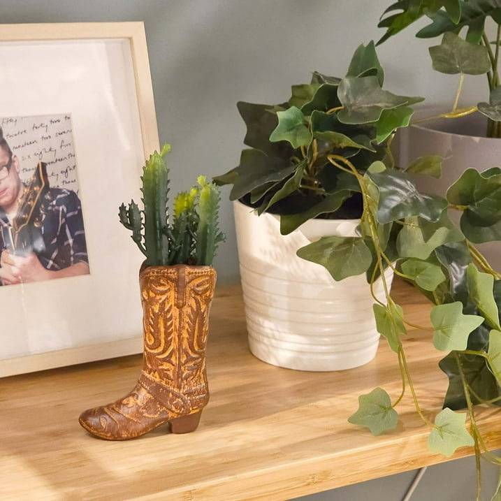 Add some rustic flair to your home or office with the Artificial Cactus Succulent. This realistic cactus features a hand-sculpted ceramic cowboy boot base with intricate etchings and designs to give it an authentic look and feel. The faux cactus is a low-maintenance option that never needs watering or maintenance, making it perfect for anyone who loves the look of plants without the hassle. This planter is a unique and eye-catching addition to any tabletop or shelf. Order yours today and bring a touch of western charm to your space!