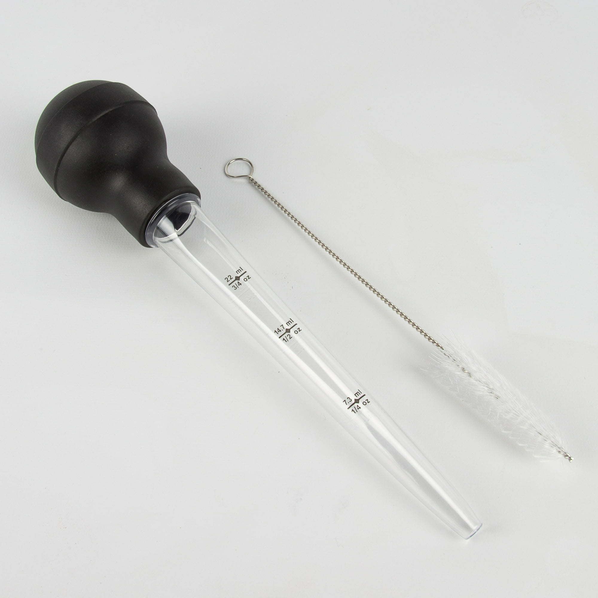 Basting isn’t just for Thanksgiving turkey. Enhance the flavor of all your favorite meat dishes with the Baster with Brush. The tight seal of the baster’s bulb makes for powerful suction. Retrieve melted butter, marinade, stock or other sauces. With the dual measurement marks on the tube, you won’t waste any sauce. After sauce retrieval, drip juices onto your meats to intensify the taste of the skin during the prep process. Cleanup is easy with a removable bulb and an included cleaning brush. From prep to cleanup, the Baster with Brush makes basting efficient and easy. Made from nylon, SAN, TPR and steel. Volume 1 ounce.