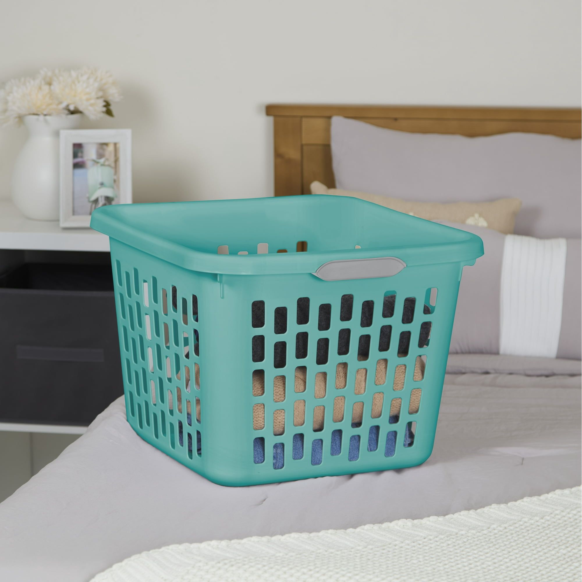 Simplify laundry day with the Sterilite 1.5 Bushel Square Plastic Laundry Basket! This basket is designed with a compact, square shape that occupies less floor space and allows for quick and effortless loading and unloading of sorted or folded laundry. Two large, durable handles integrated into the rim allow for comfortable carrying, especially through doorways, hallways and up & down stairs. The reinforced rim and durable design ensures fully loaded baskets will hold up under regular day-to-day use. The rectangular hole pattern provides plenty of ventilation for clothes and the smooth polished interior that is snag proof and easy to clean.
