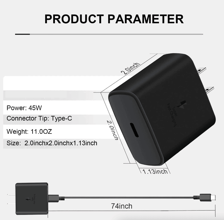 The 45 watt usb c charger block kit come with a detachable USB-C to USB-C cable (6FT Included), so you can charge your phone from any other USB-C power source such as your phones, tablets, and computers. Use the cable to sync and transfer files at blazing speeds with your Galaxy or any other compatible smartphone or laptop.