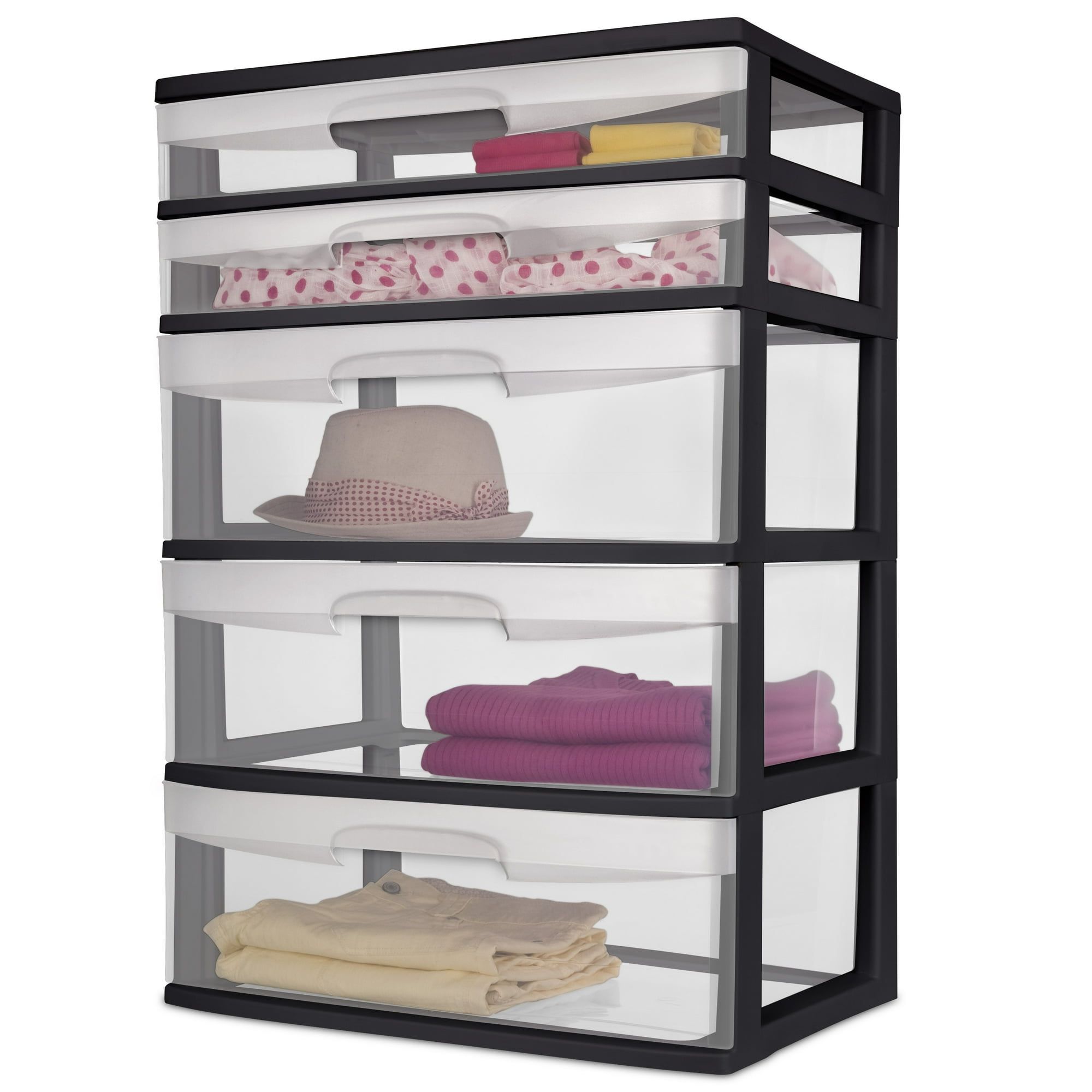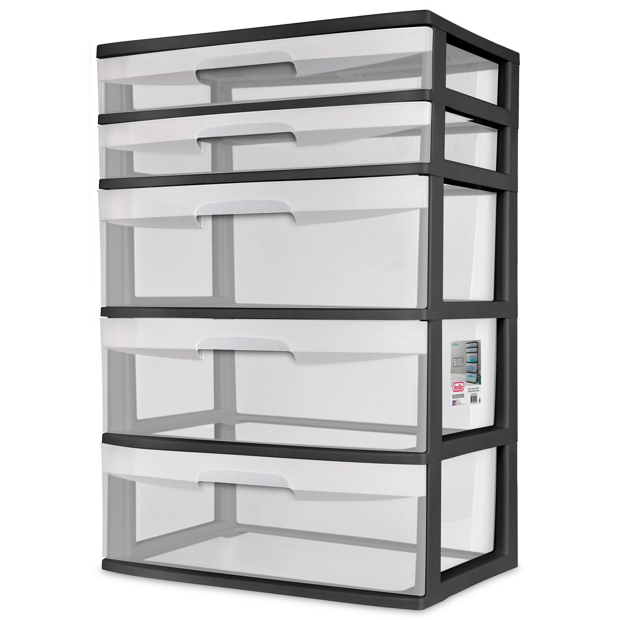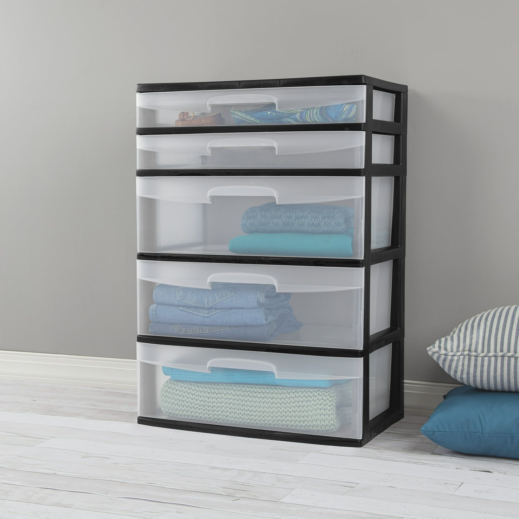 5 Drawer Wide Tower, with both Shallow and Deep Clear Plastic Drawers, Black