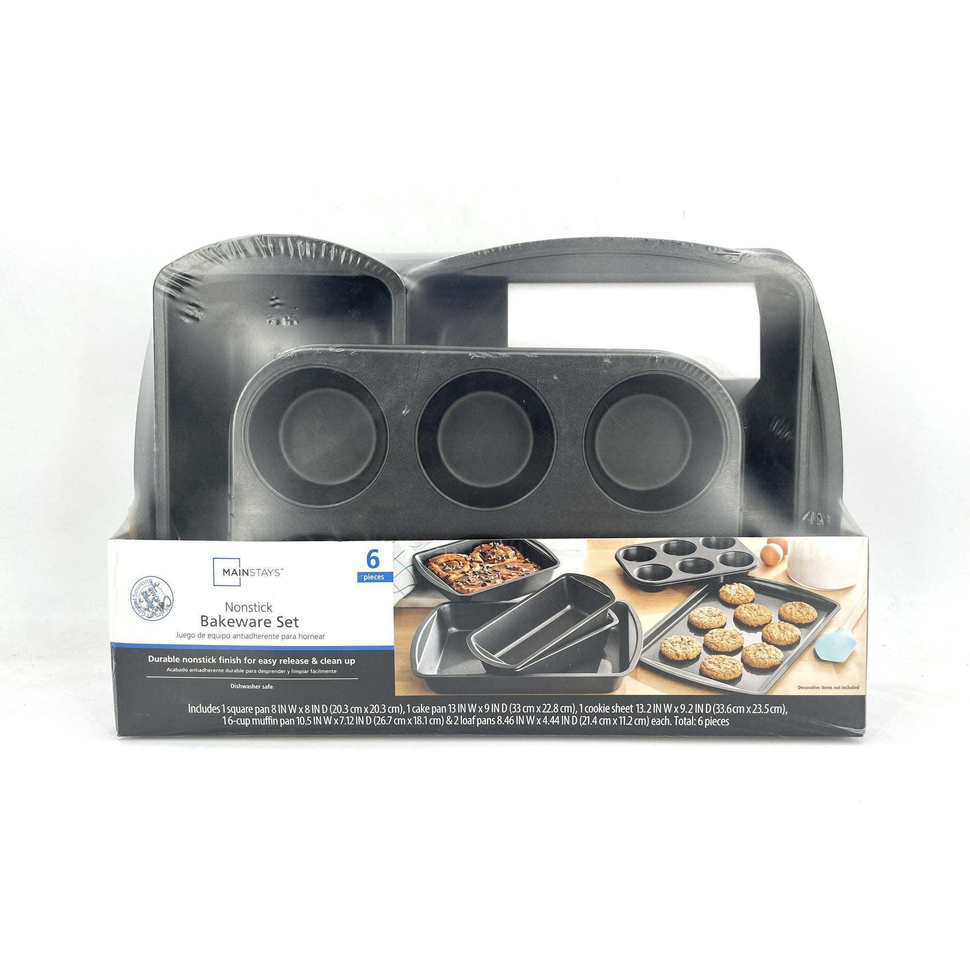 This sturdy 6pc bakeware set features all the necessary equipment for making your favorite desserts, cookie, breads and much more. Made of reliable carbon steel, excellent heat transfer. Includes: one square pan, one roster pan, one cookie sheet, one 6-cup muffin pan and two loaf pan. So all of your baking needs are met. Non-stick coating for easy food release and effortless cleaning. Before first use and after wash use, wash pan thoroughly with mild dishwashing detergent and warm water. All of these pans nest together for convenient storage after use. This good starting over set is a wonderful present for a housewarming shower.