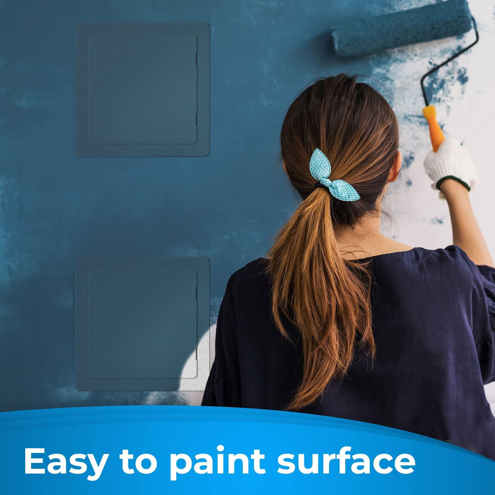 2.premium quality: made of impact-resistant abs plastic with uv stabilization, our drywall access panel does not fade in the sun, change color or corrode. durable plastic textured surface for maximum adhesion, the white finish can be painted in any color or wallpapered. thanks to the water repellent material, it can also be installed in basements, attics or bathrooms.