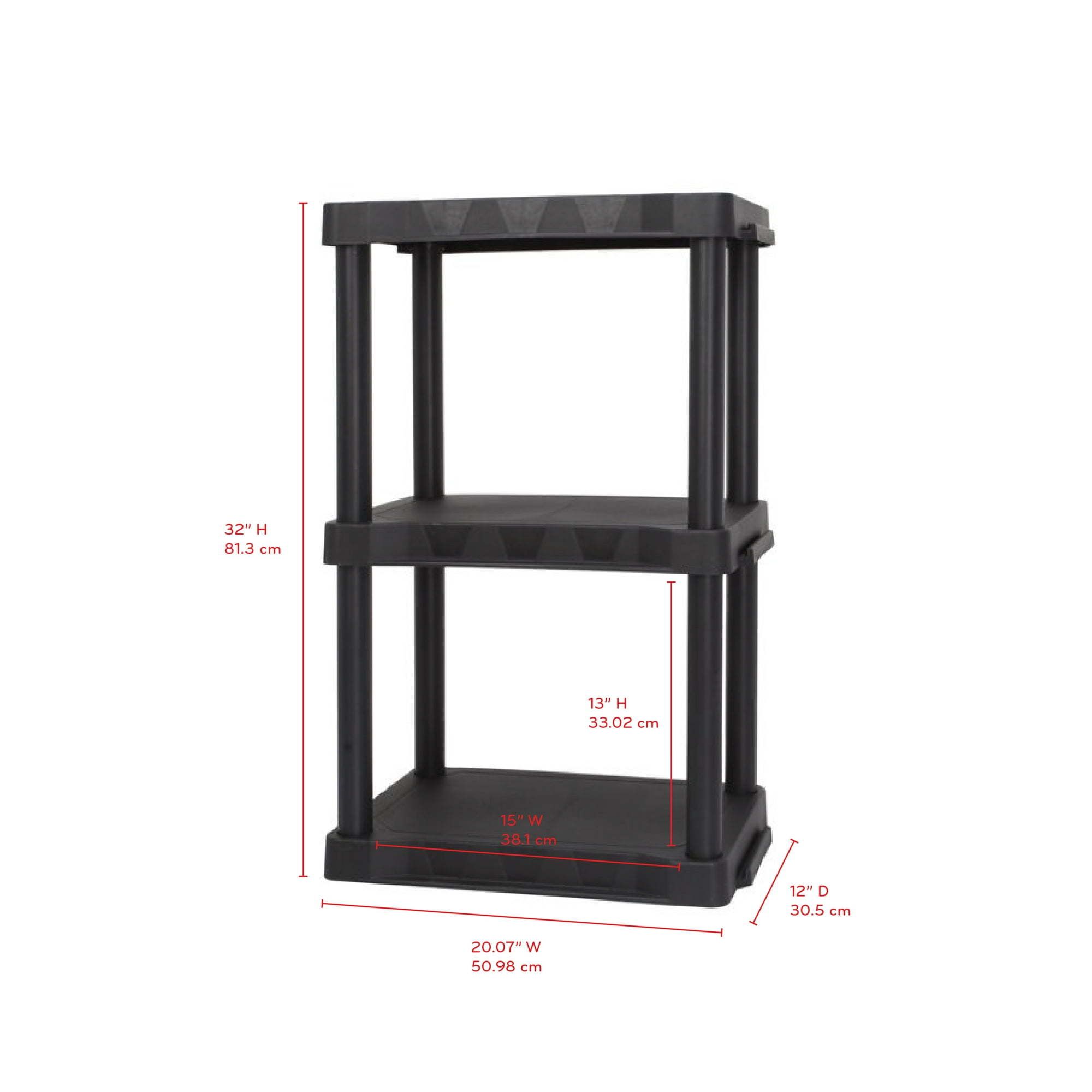 Black Plastic 3 Shelf Shelving Unit is a great solution for all your storage needs. This is perfect for any space where you might need reliable, sturdy shelving, such as, the garage, basement, utility room or closet. It is made from a durable and long-lasting black polypropylene plastic that can hold up to 50 pounds per shelf when evenly distributed. This product has interlocking shelves that require no tools to assemble and comes with a QR code video tutorial. This shelving unit is easy to maintain and is built for years of use. Pick up yours today, while supplies last, only available at and .com.