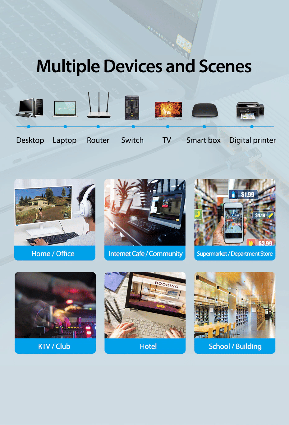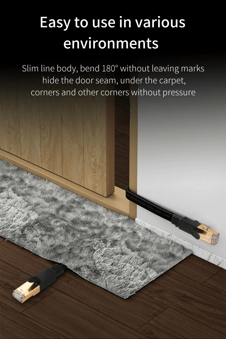 The high speed ethernet cables are super flexible and much easier to manage when run under the carpet and doors or along walls with free cable clips, meeting all your requirements for home and office, and public network location. Help you to maintain the neat appearance of your room and home.
