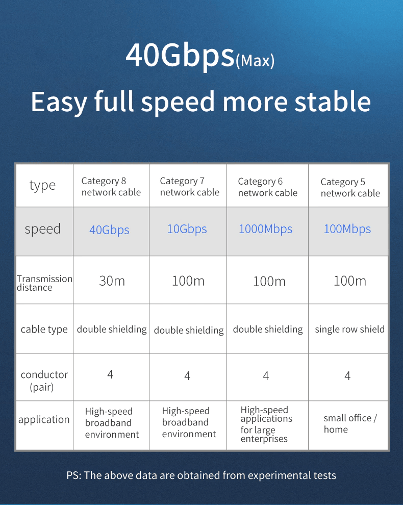 Shielded with a high quality UV-resistant PVC jacket and premium material, Cat8 Ethernet wire is more Durable, flexible, waterproof, anti-corrosion, anti-aging, and tough for use. It can withstand direct sunlight and extreme cold & humid & hot weather yet still working efficiently. Great quality Cat 8 patch cable suitable for indoor or outdoor usage.