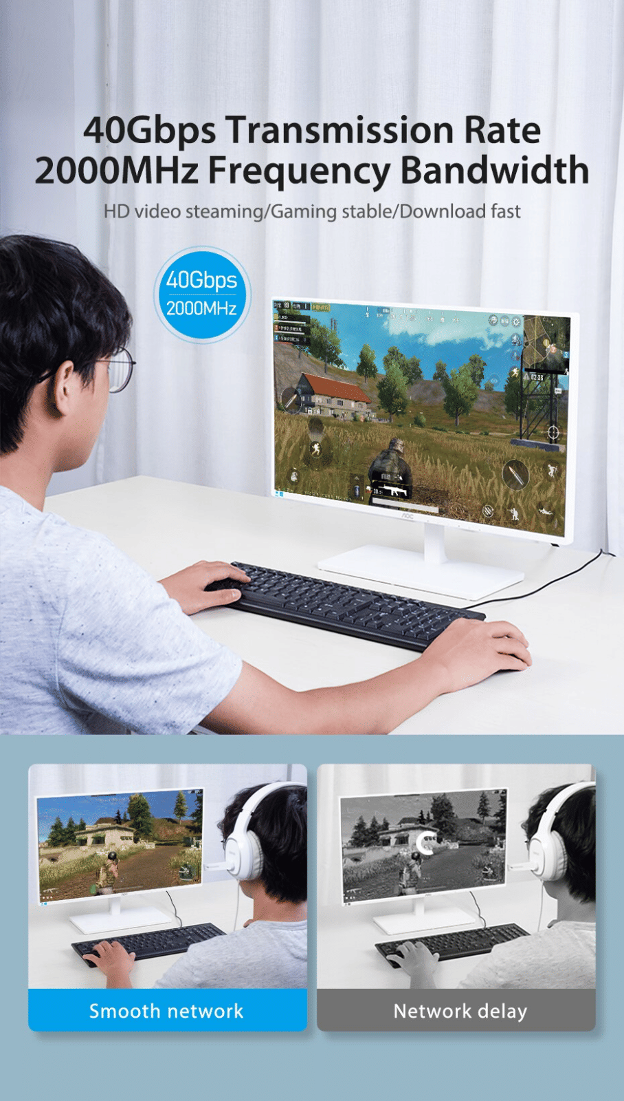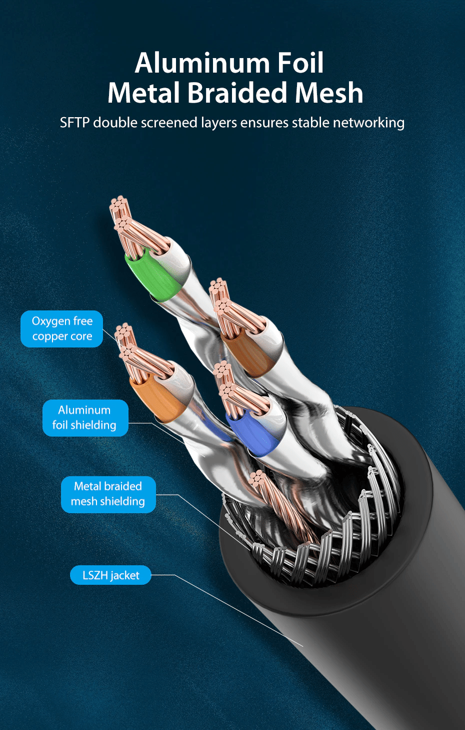 Cat8 Ethernet cable is made of 4 shielded foiled twisted pair(F/FTP) and single strand OFC wires(26AWG) which supports bandwidth up to 2000MHz and boosts the speed of data transmission up to 40Gbps. Shielded Cat8 and the improved quality in twisting of the pairs, Cat8 can reduce any signal interference to the full extent. Allow you to stream HD videos, music, surf the net, play games at Hyper Speed.