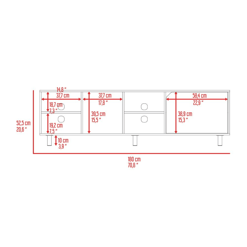Conquest TV Stand is the perfect way to organize your new TV. The modern design and functionality of the drawers and shelves make them ideal for any environment. Plus, the back holes on the inside keep your cables orderly. Its size (20,6”H X 70,8” W X 13,7′ ‘D) is perfect for any room, with an ample countertop (72.1”) and ideal four legs (3.9”) ***Objects and shelf are not included***. Designed with elegant Light Oak, White manufactured wood finish.