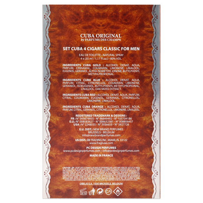 Be the first to review “Cuba by Cuba for Men – 4 Pc Gift Set 1.17oz Cuba Gold, 1.17oz Cuba Blue, 1.17oz Cuba Red, 1.17oz Cuba Orange” Cancel reply