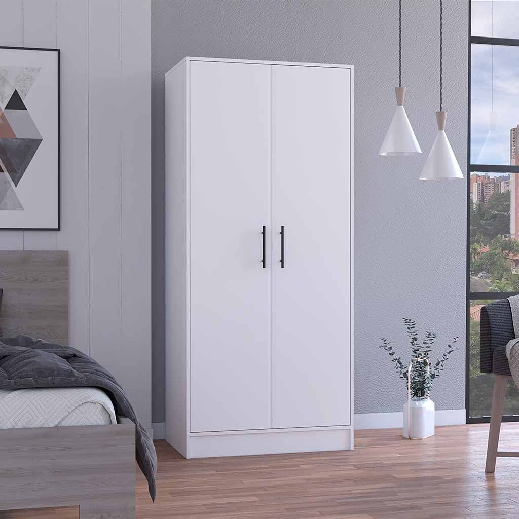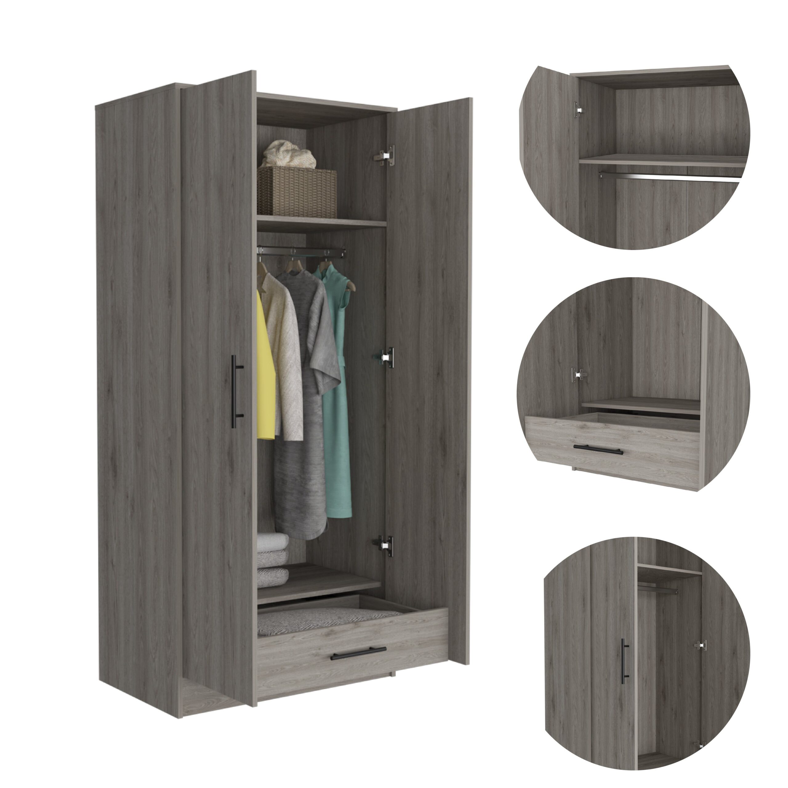 Darwin Armoire, Double Door Cabinets, Metal Rod, Metal Handle, Two Shelves, One Drawer