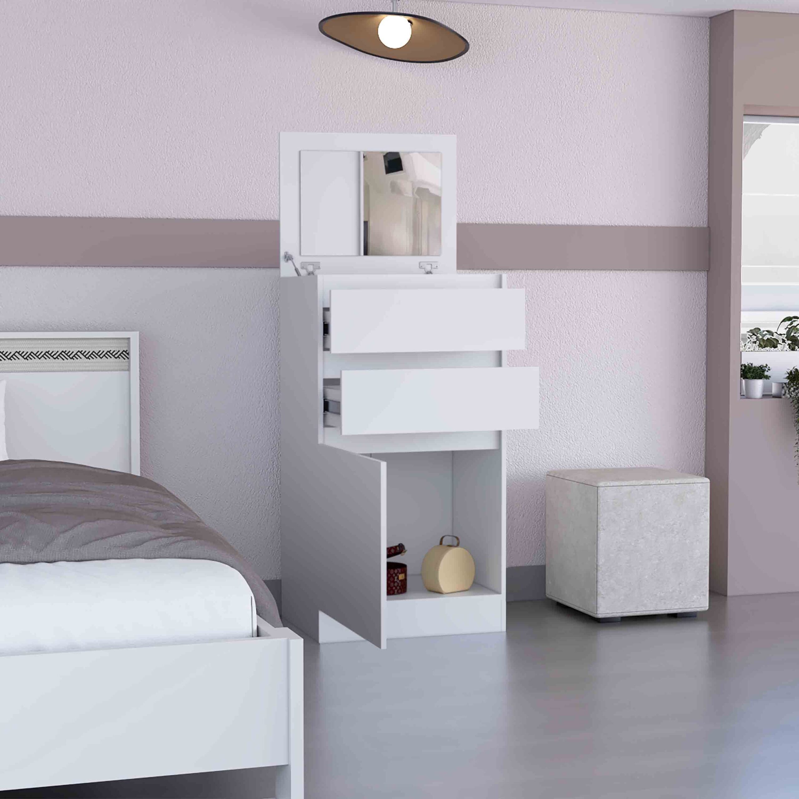 Diamond Dresser, this one-of-a-kind diamond dresser is sure to be your favorite piece of furniture. Thanks to its mobile shelf with a mirror and jewelry drawer, it’s ideal for keeping your favorite products in its two drawers (7”H X 23.3”W) and utilizing them as a cosmetic station. It’s the perfect size for your room and features a uniquely designed diamond pattern with an ideal Superior Top (29,4”) You won’t find anything like this anywhere else. Designed with elegant dark walnut and white manufactured wood finish.