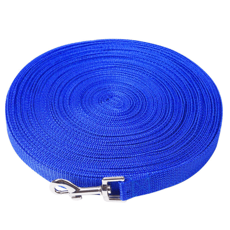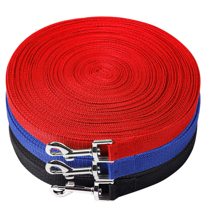 Our training rope is sewn with a high-density machine, and the stitches are dense and firm. This nylon dog lead is 3/4 inch wide and in lengths of 15 feet, 30 feet, 50 feet, and 100 feet long. Great for hiking, camping, hunting, backyard, beach, recall training, outdoor sports with tennis and swimming.
