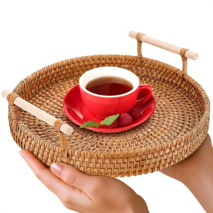 Rattan Tray 8.7 Inch Round Woven Serving Basket with Handles Decorative Tray for Coffee Table Bread Fruit Vegetables Restaurant Home Use