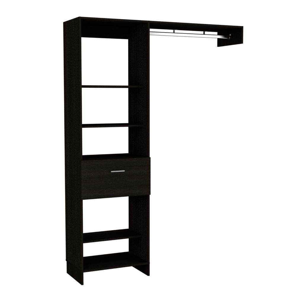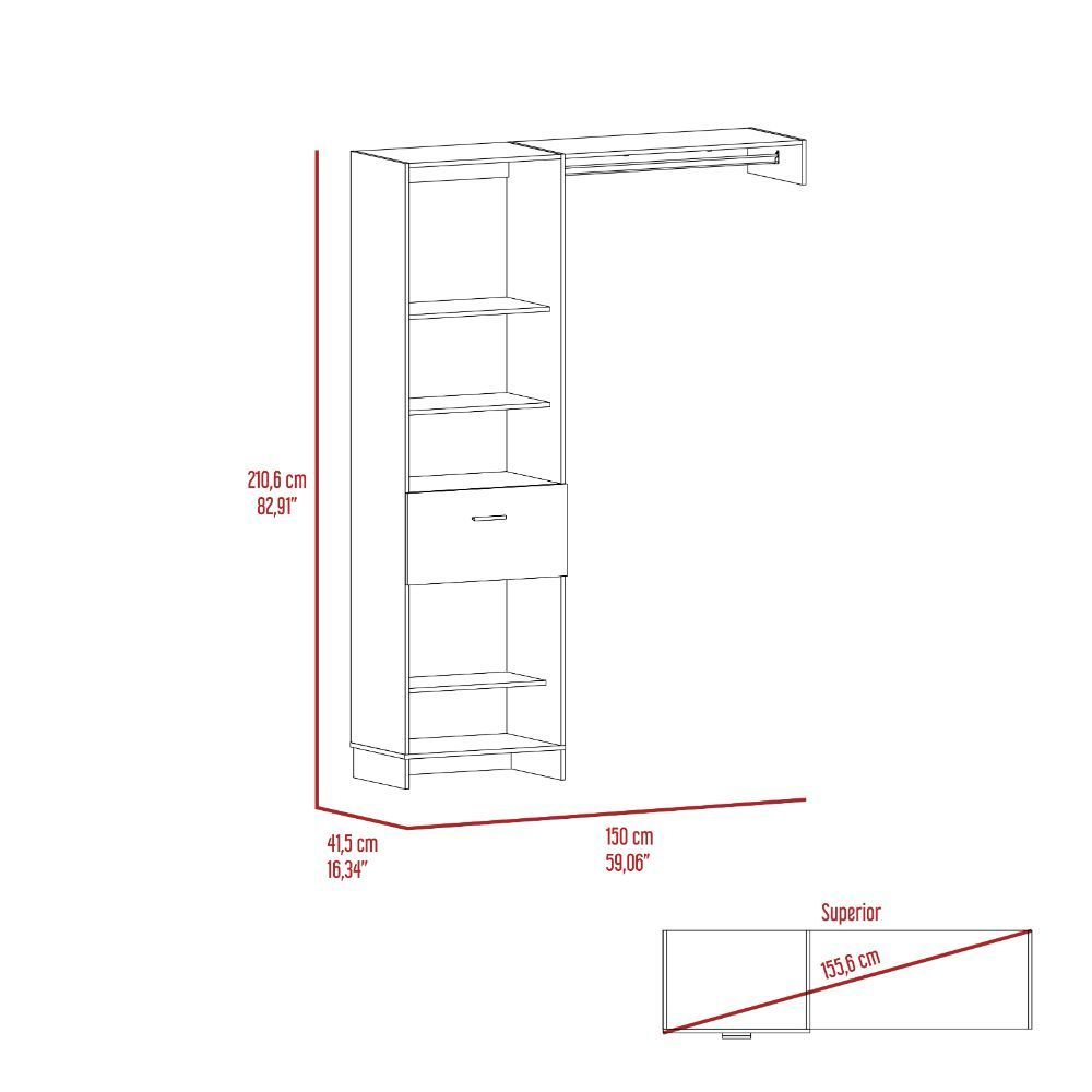 Dynamic Closet System, storage is no longer a problem. This closet can adopt an innovative, space-saving cabinet to fit any room, giving you the extra storage, you need in a uniquely stylish way. This product has everything you need to get your belongings organized with five shelf applications, a drawer (20,1”W X 14,1”H), and a metal rod (35,5”) that fits perfectly in any space. Designed with elegant black wengue and White manufactured wood finish.