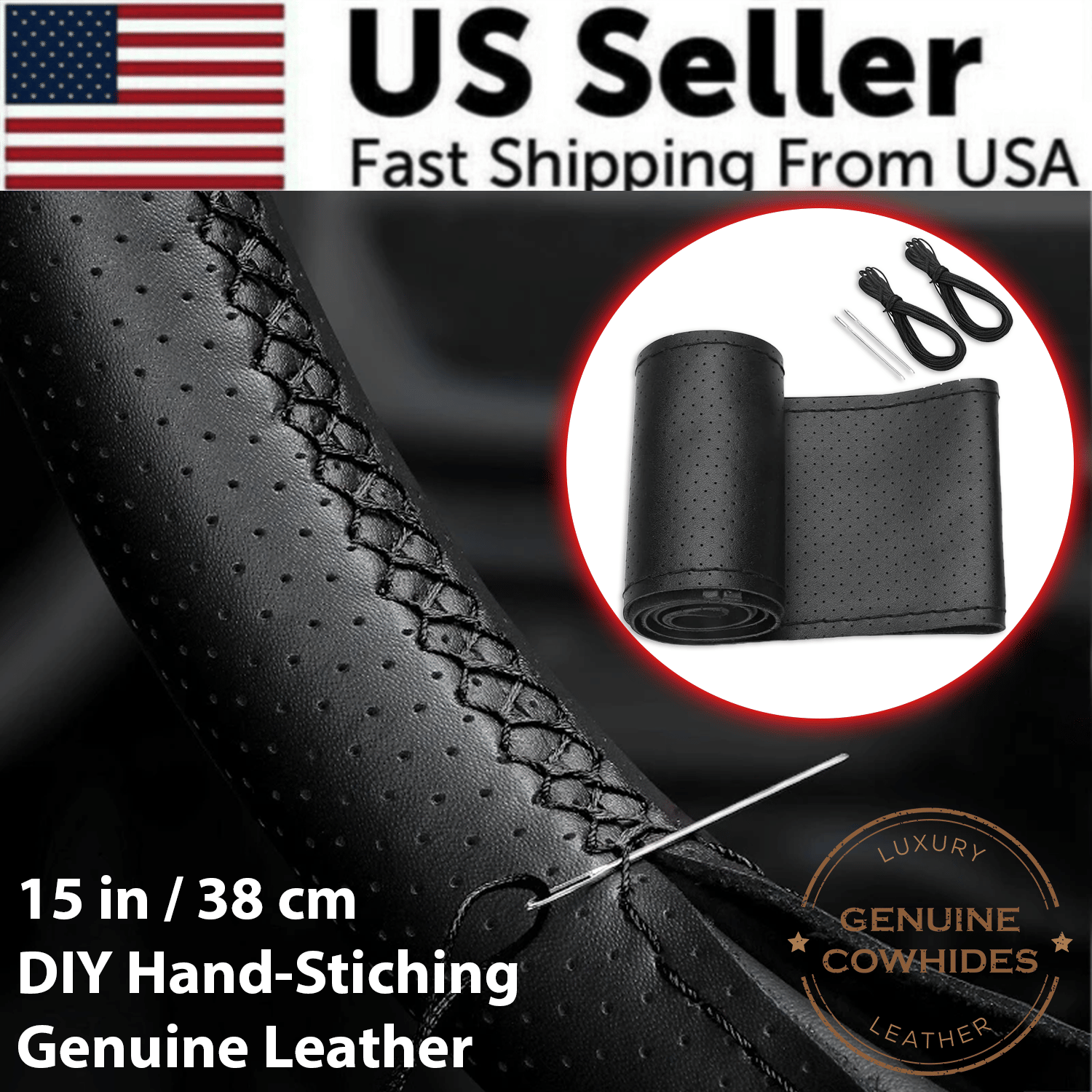 Genuine Leather DIY Car Steering Wheel Cover Anti-slip For 15"/38 cm Black US