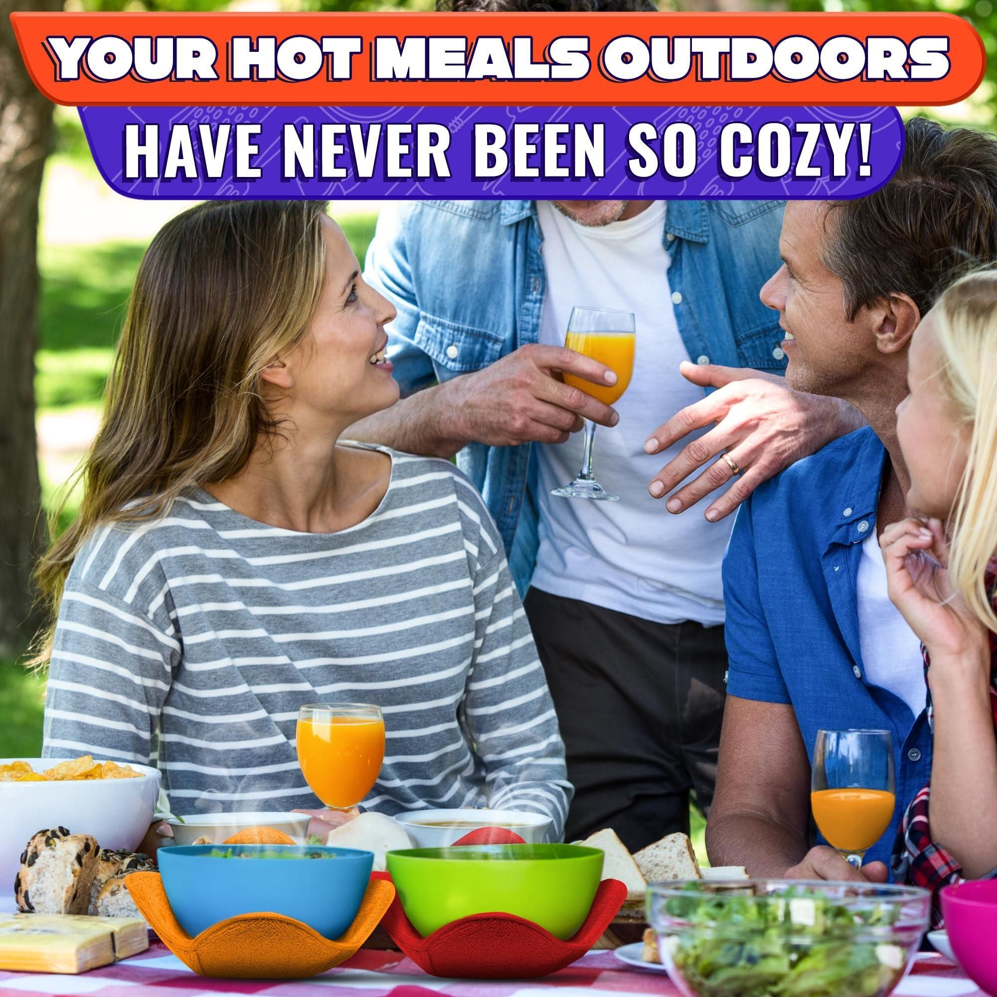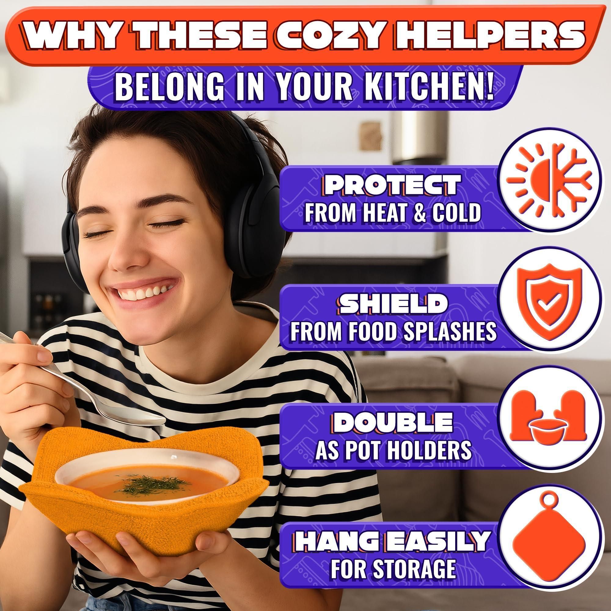 1.vibrant set of 5 colors: our microwave bowl cozy holders add style while the hot bowl cozy holder design shields hands from burns, ensuring safer, more convenient handling of warm dishes