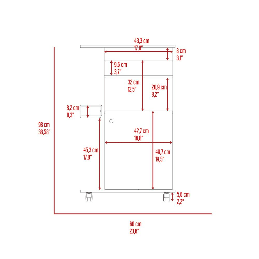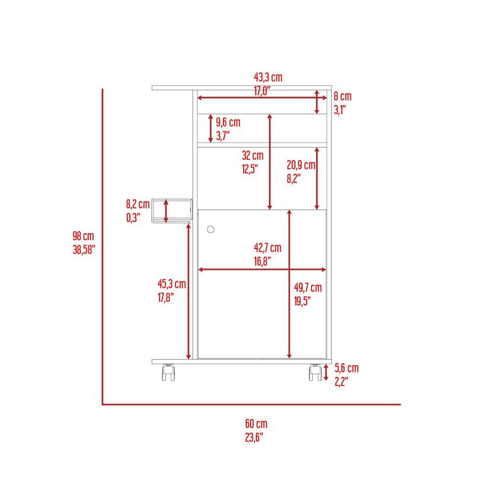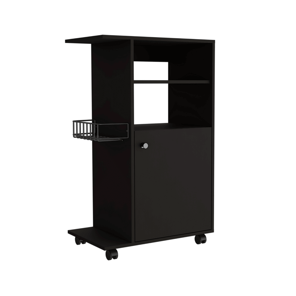 Opal Kitchen Cart, this ergonomic cart makes the idea of adding additional storage to your kitchen a reality. With a vast storage capacity, it is both elegant and functional. The superior top is designed exclusively for the microwave, and the four caster wheels (2,2”) can be relocated as needed, with a rack for extra storage. Complete your kitchen collection with this amazing kitchen cart! Designed with elegant black wengue and white manufactured wood finish.
