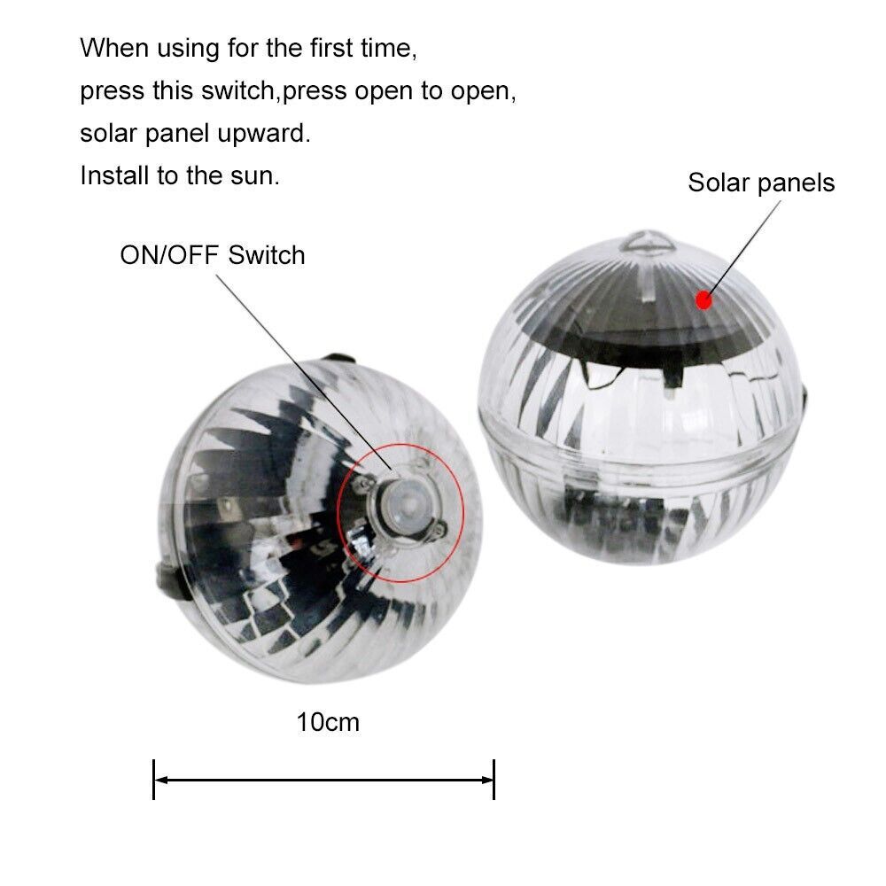 100% solar charged led pool light. Just leave these floating pool lights out in the sun all day charging, floating in water.You don t need to do anything, they automatically turn off and get charging during the day, then automatically turn on at night. The floating pool lights can glow up to 8-10 hours on a full charge. Attention: Please always keep the solar panel up, otherwise the floating pool lights cannot be charged.