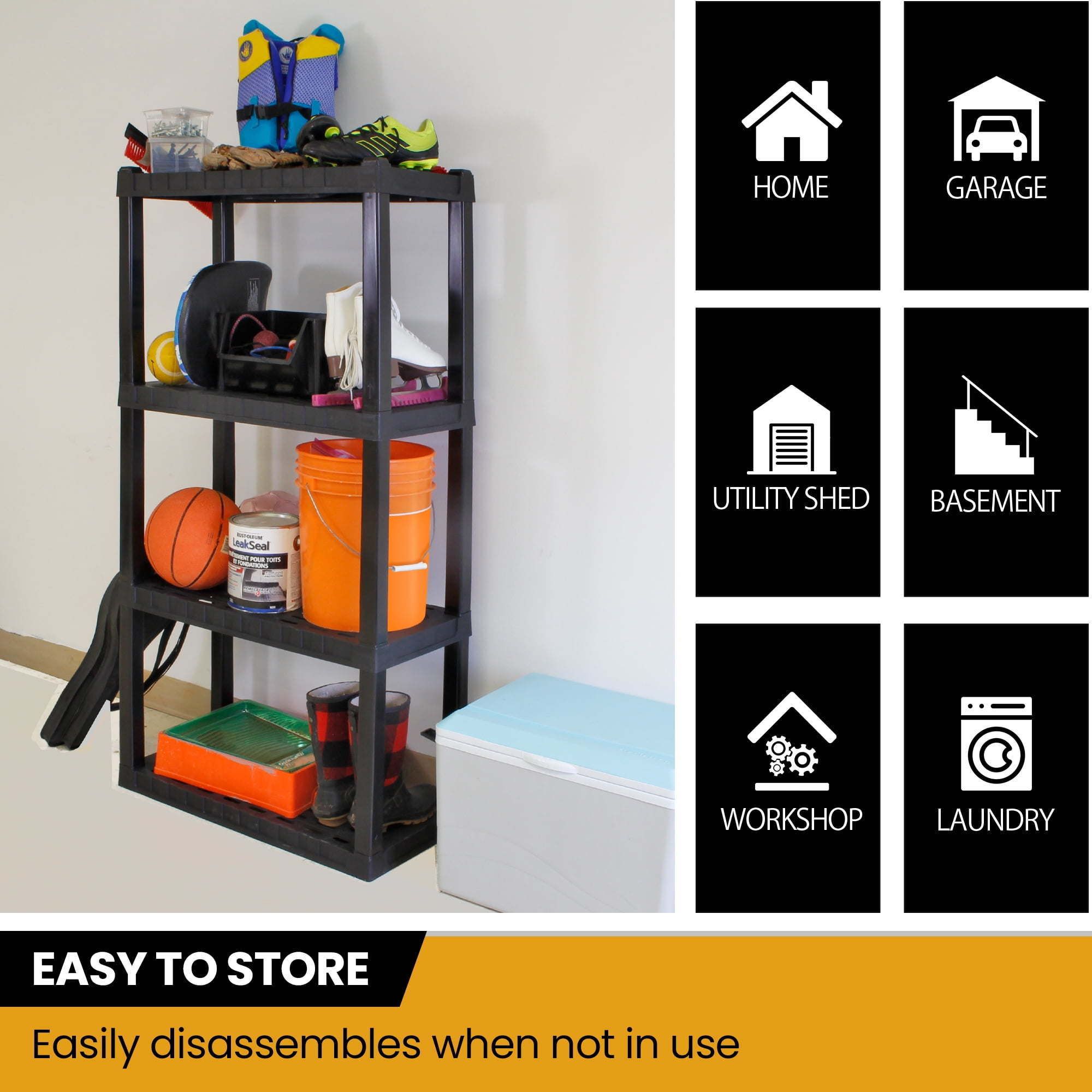 Maximize your storage space with this Plastic Garage Shelves versatile 4 tier plastic shelves, proudly manufactured in North America. Adding garage shelves is one of the simplest ways to organize even the most limited spaces, protect your items from damp floors, and more. This lightweight plastic shelf snaps together with no tools required so you can get started on your home organization project right away. Heavy-duty moulded plastic shelves hold 150 lbs (68 kg) each and will not rust, dent, stain, or peel. Ventilation holes allow air to flow and control moisture, keeping your items clean and dry. Nested legs and anchor holes offer added support, and the interlocking design lets you easily and securely link together multiple units. Whether you are decluttering your basement, organizing your craft room, or spring cleaning your garage, Hyper Tough Plastic Shelves has the perfect shelving solution for you.