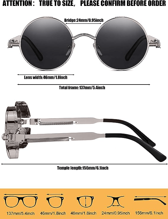 • RETRO STEAMPUNK STYLE Steampunk style round sunglasses, Designed for men and women. Vintage sunglasses make creative street artists look super cute. Original fashion brought by hippie sunglasses will make you. The style is never out of date.