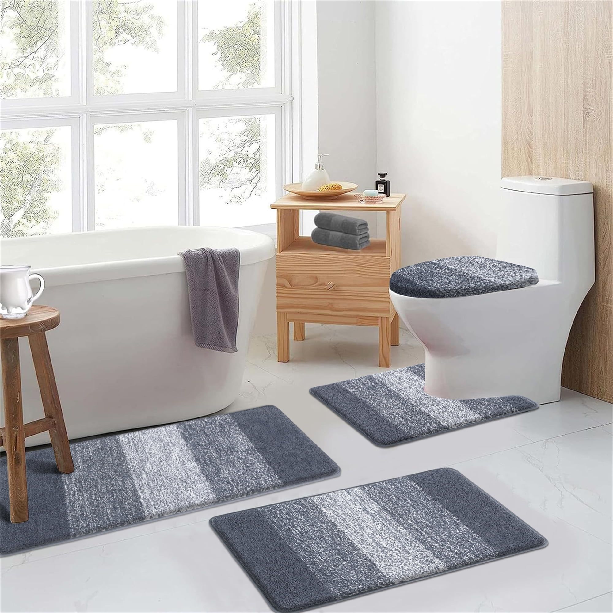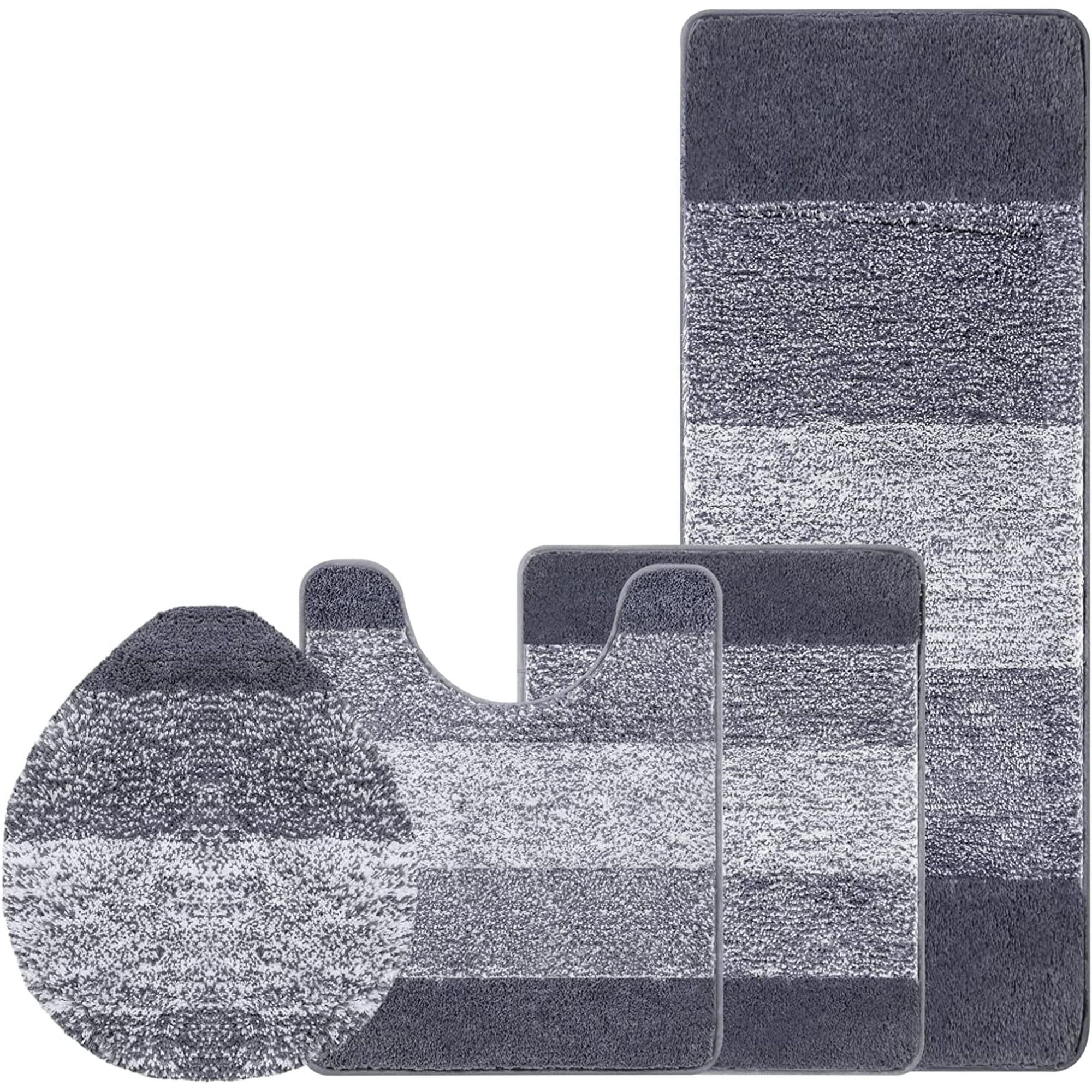 Ultra Soft Comfort: Made of high-quality microfiber, this bathroom rug set is soft and comfortable, providing a cloud-like feel underfoot.Non-Slip Design: Features an upgraded non-slip TPR backing for a firm grip and increased ground friction, ensuring safety and durability.Highly Absorbent: The thick, soft bath mat quickly absorbs excess moisture, keeping your feet dry and protecting your floor from damage.Machine Washable: Designed with microfiber locking technology, this rug set withstands frequent machine washes without fading, lint, or warping.Versatile Use: Suitable for use in the bathroom, bedroom, living room, sink, and bathtub, with various colors to match different decors.Perfect Dimensions: The four-piece set includes sizes 18"x26", 18"x48", U20"x23", and Cover19"x21", ideal for comprehensive bathroom coverage.