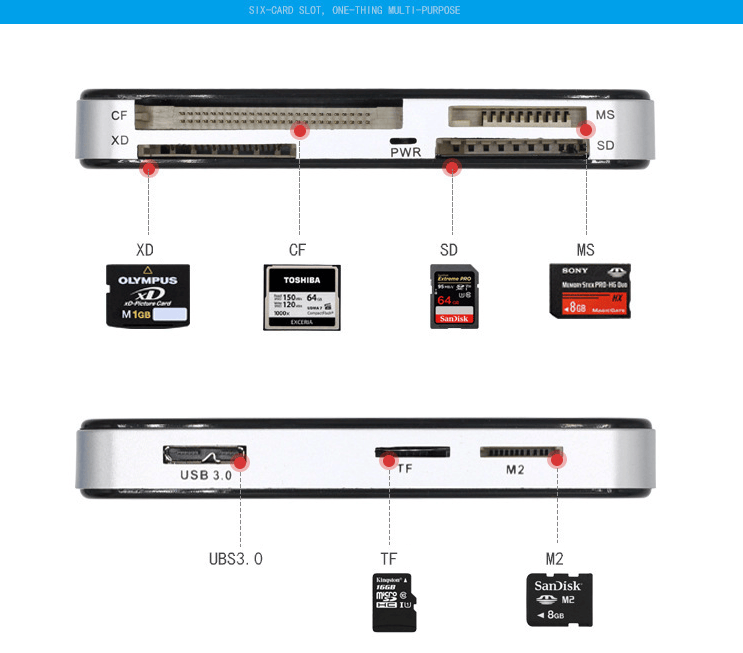 • 6-in-1 USB Card Reader This USB 3.0 card reader satisfies your need of almost every single card. There are 1*CF slot, 1*SD, 1*TF, 1*Micro SD, 1*XD, 1*MS at your choice and convenience. What s more, this card reader can read and write 5 cards at the same time, which can greatly improve your work efficiency.