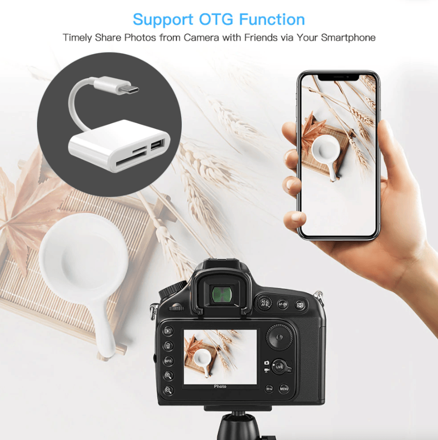 You can quickly transfer files from your memory cards/USB storage to the compatible Type C devices , or back up files from Type C devices to them, or transfer between 2 cards, transfer between card and U-disk.