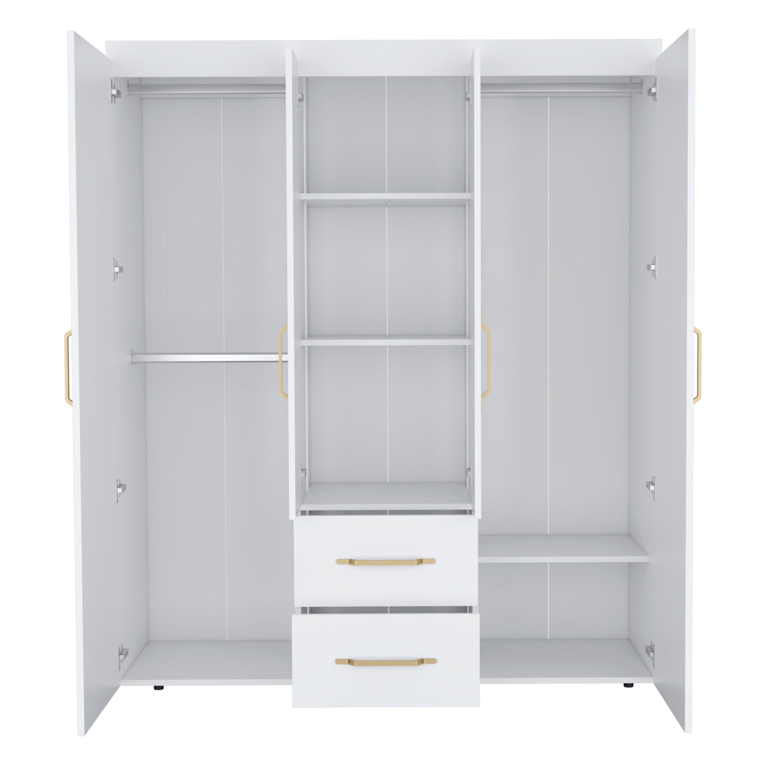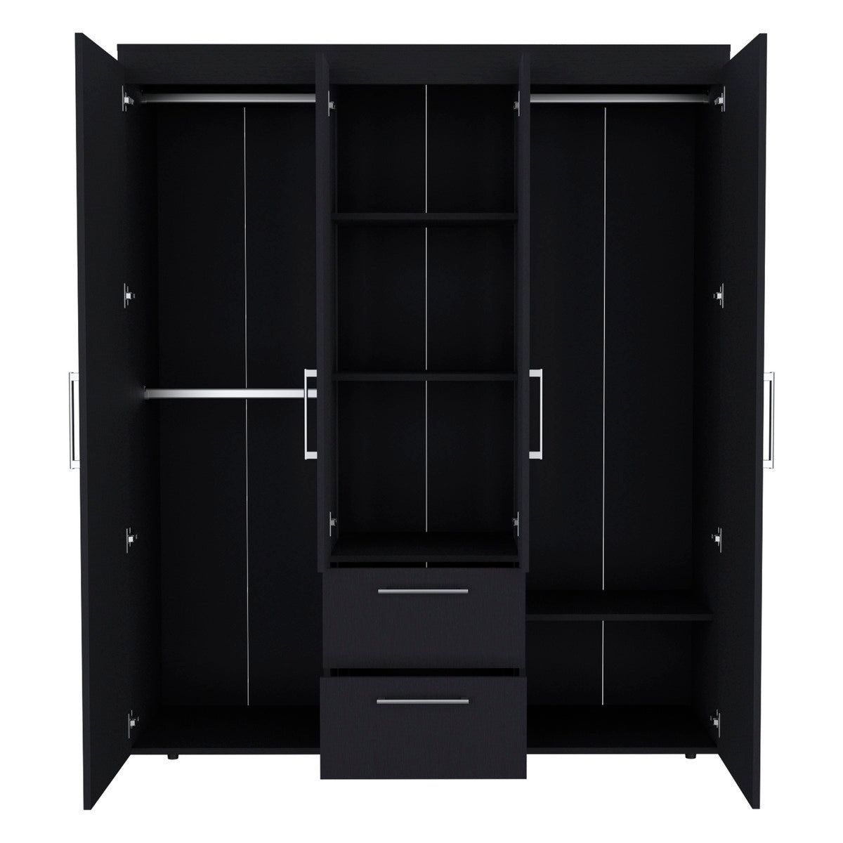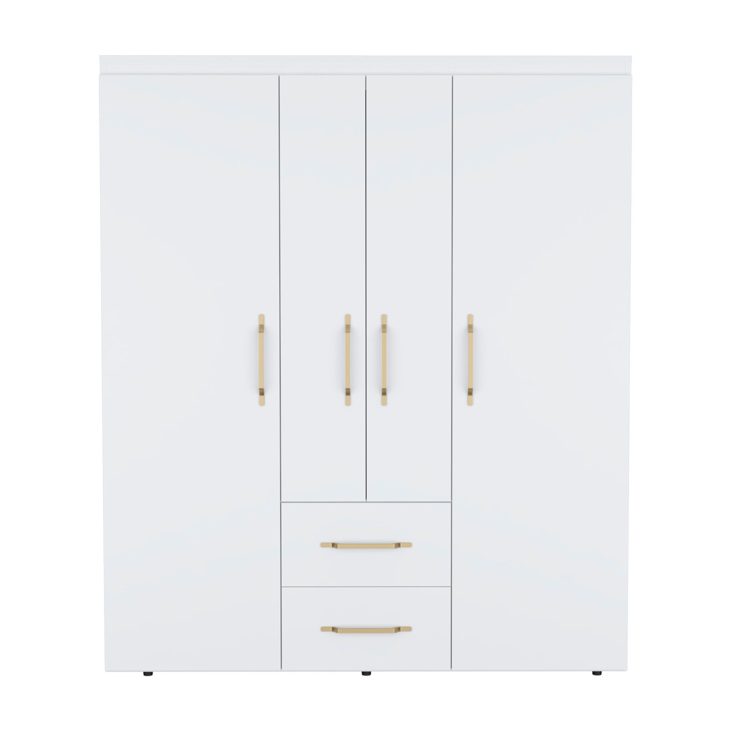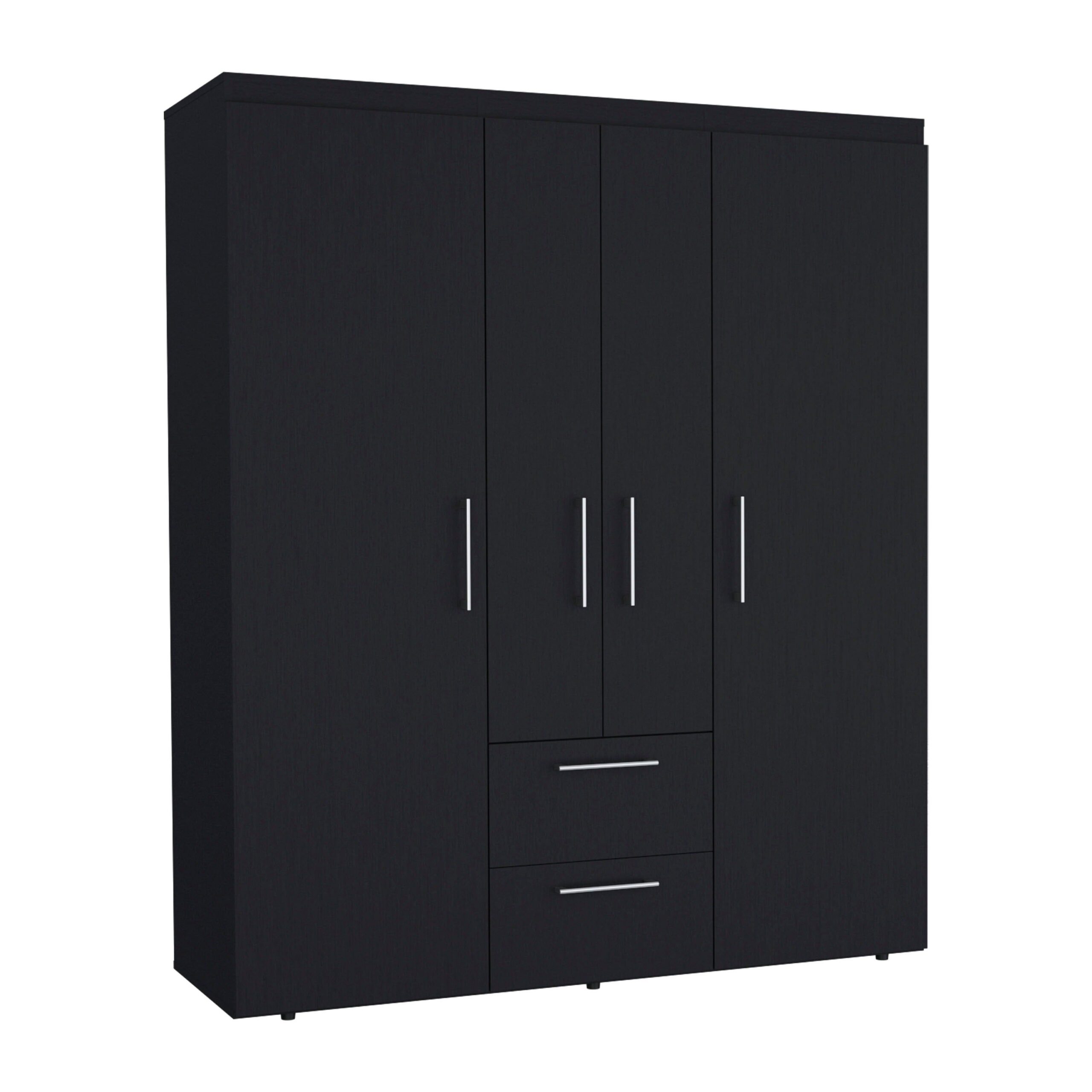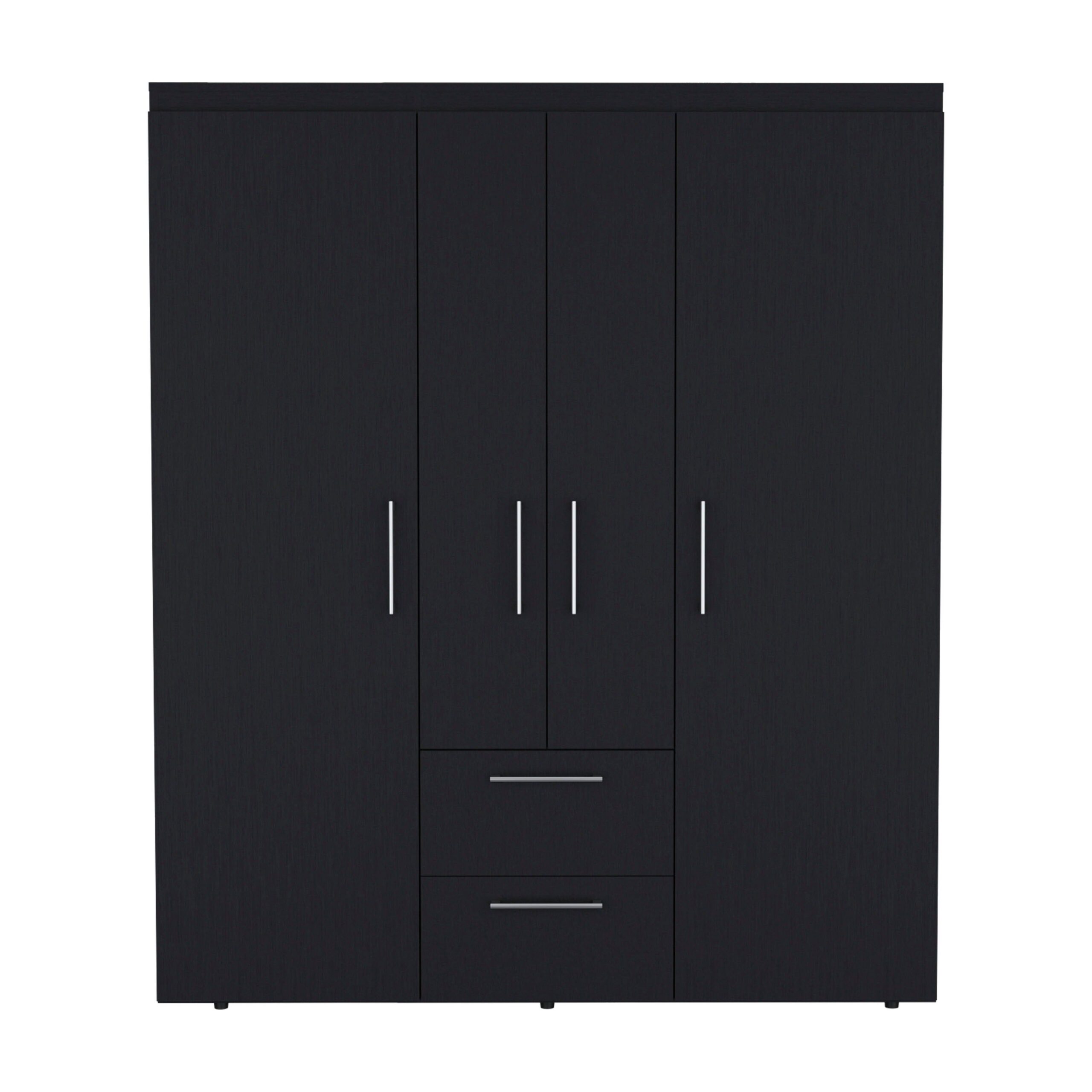 The Valier Wardrobe is a wonder of elegance and storage that will transport you to a world of order. It is made to meet all your wardrobe requirements and is offered in sophisticated manufactured wood finishes in white or black. A door (19"W x 70"H) on either side opens to a space with a hanging rod, making it ideal for keeping clothes organized and handy. Two bottom drawers (16.3"W x 4.3"H) provide additional space for accessories, and the central double-door unit (18.6"W x 15.5"D) at the center of the Valier houses movable shelves. Elegant metal handles that provide accents. Designed in black and white.