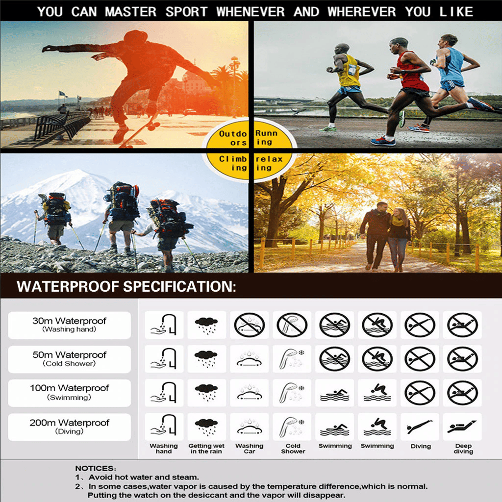 - Waterproof: 164 Ft / 50 M water resist, Please DO NOT press any buttons underwater, and in case of a damaging waterproof ring, please keep it away from steam and hot water.